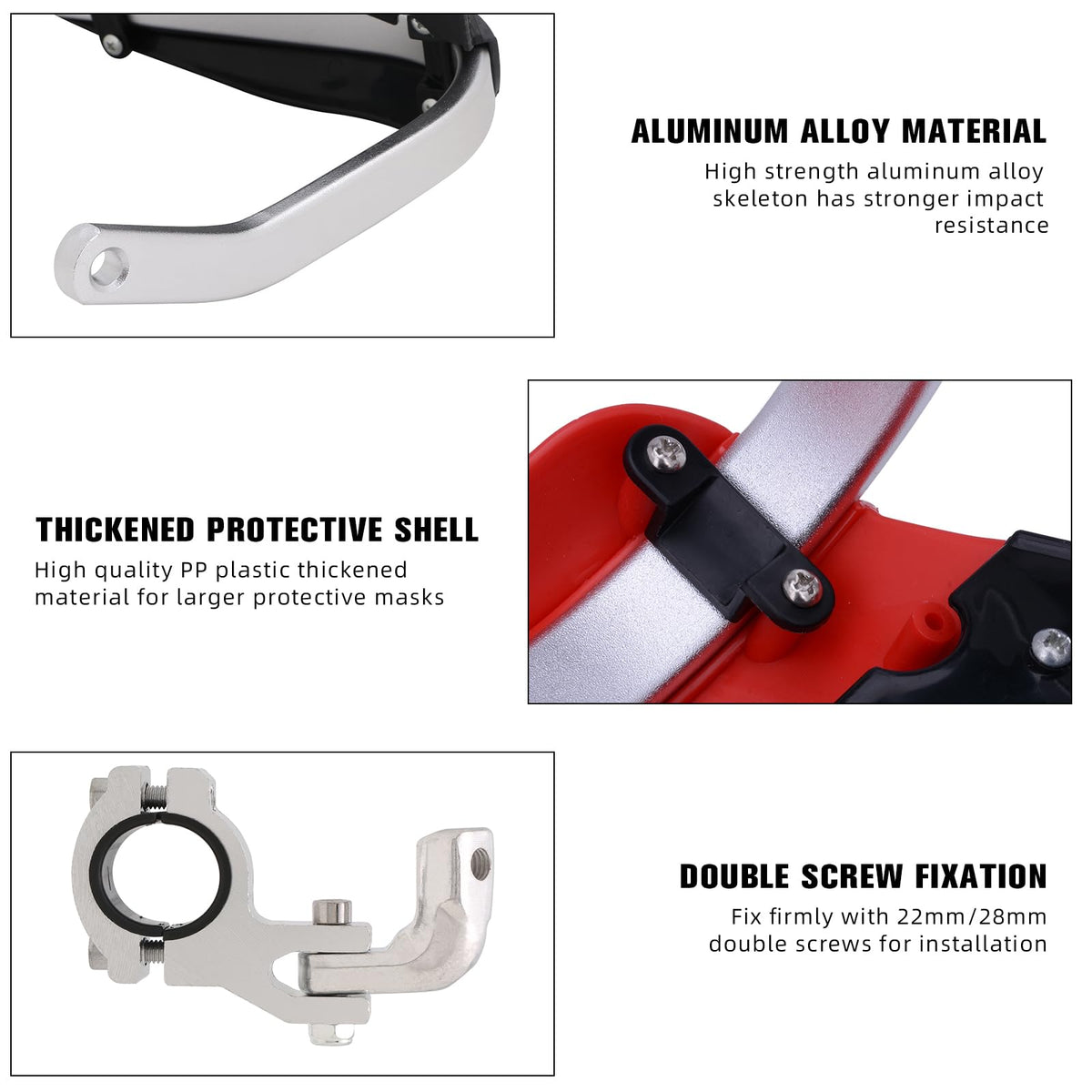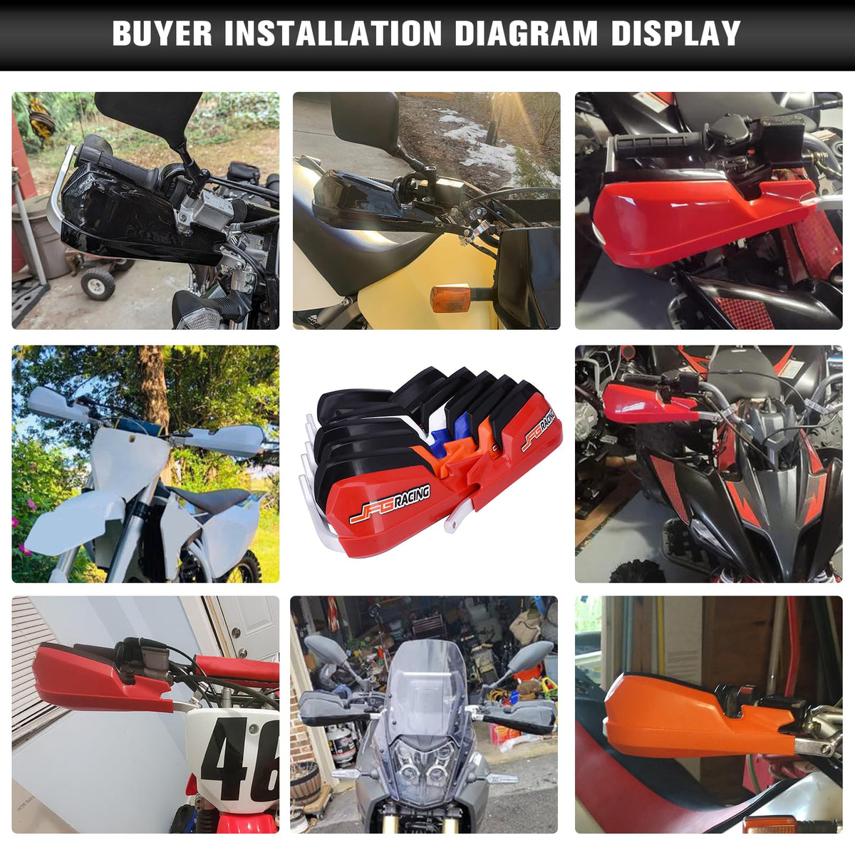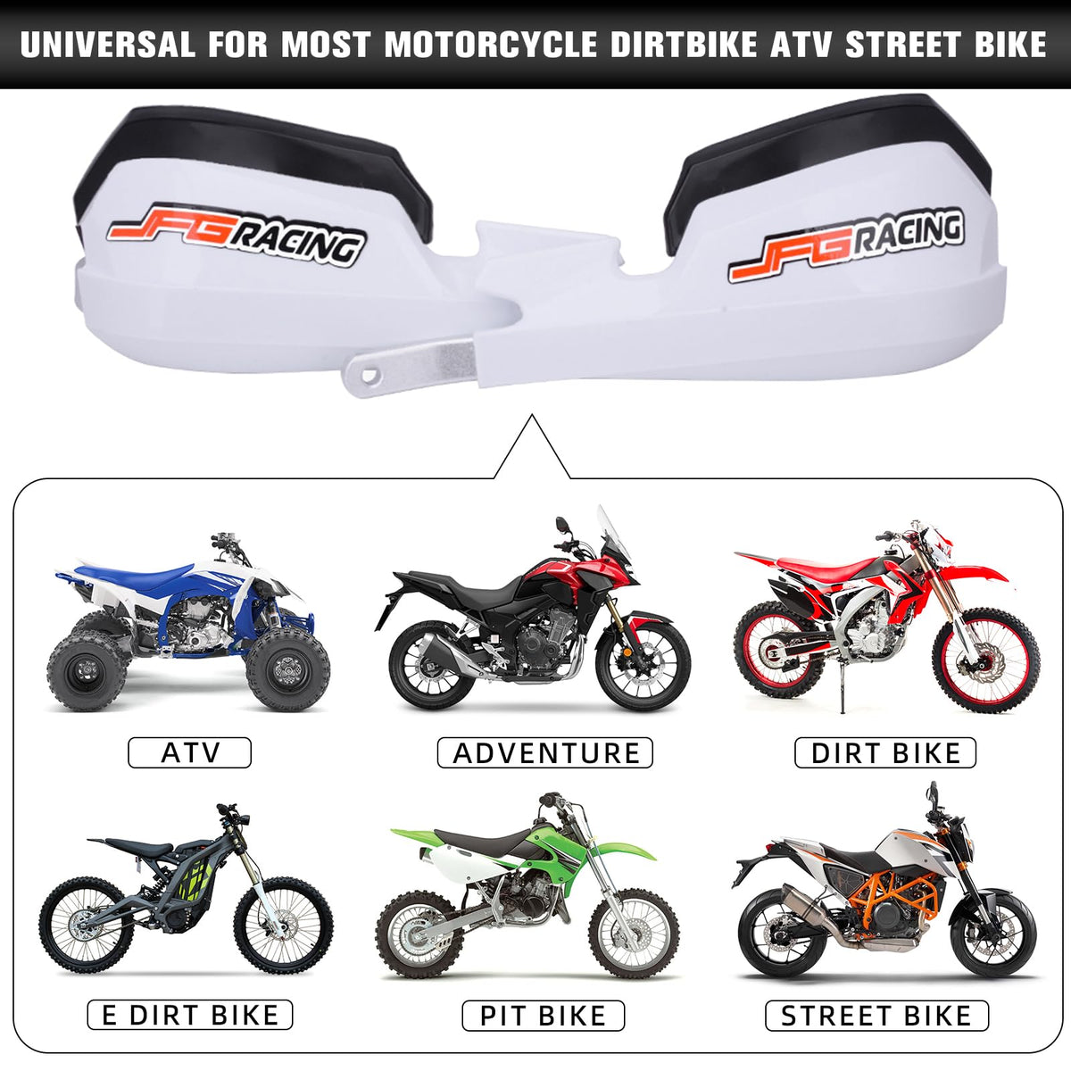 ?Material?These hand guards made from ABS high impact plastic moulded around solid aluminium bar. | ?Fitment?Suitable for all handlebars range 7/8 and 1 1/8. | ?Efficiently Protect Hands?These hand guards solid enough to take in more than a few blows from rocks and debris while keep your hand safe and well-hidden from mud and cold wind. The awsome design from JFG RACING can also decorate your bike into better look. | ?Easy Installation?Simply insert handguard spacers into the end of your handlebar & tighten. As you tighten, the spacer expands inside your handlebar & becomes tight, locking the Hand Guards into position. | ?Package Include? 1 pair hand guards and JFG RACING logo sticker,1 set of mounting kits.
