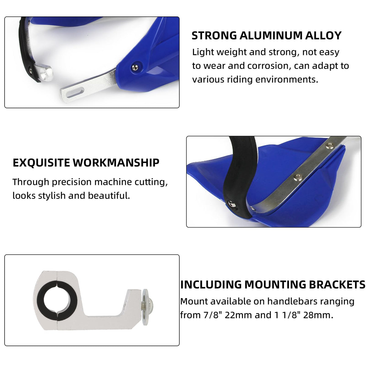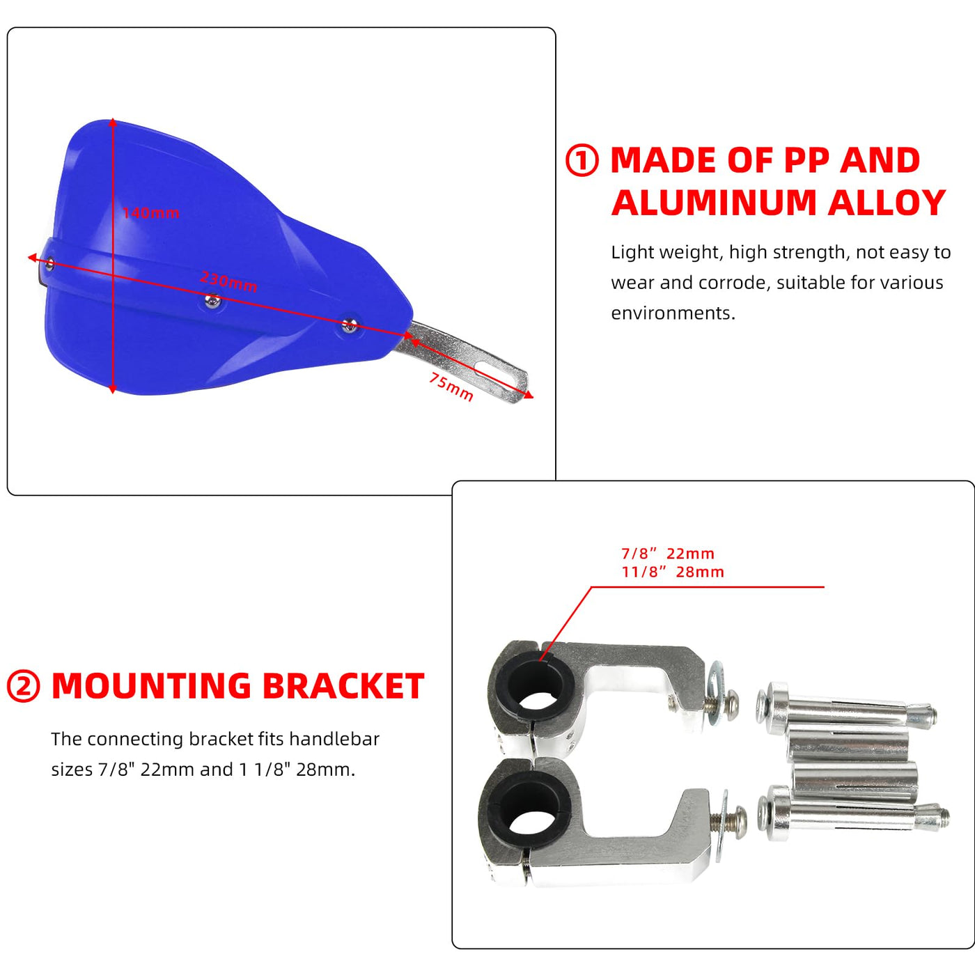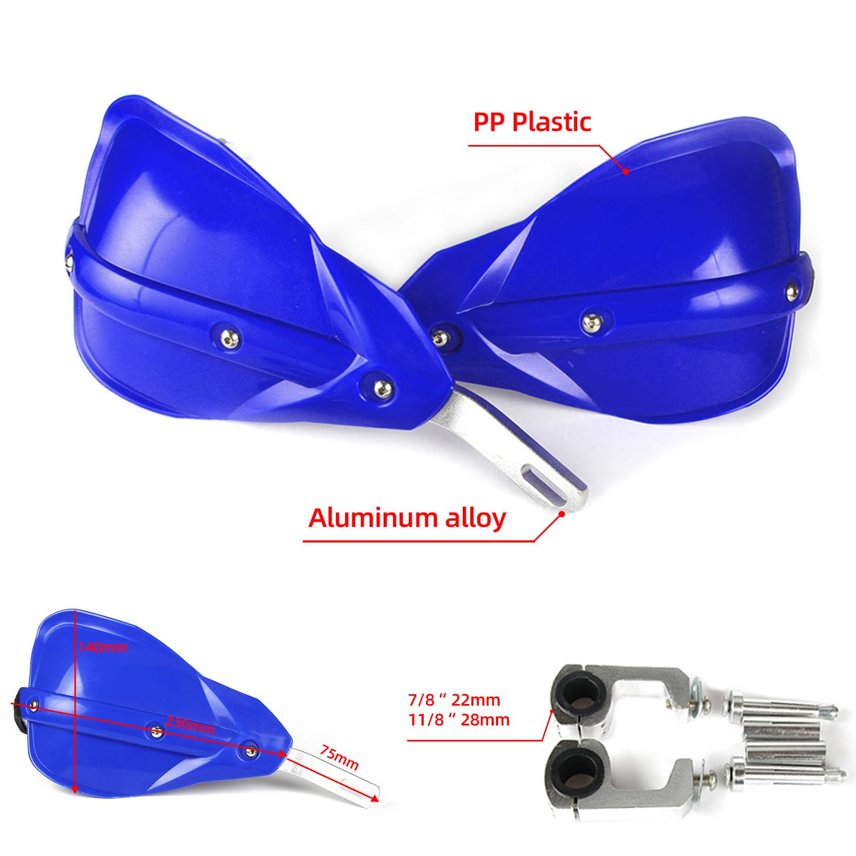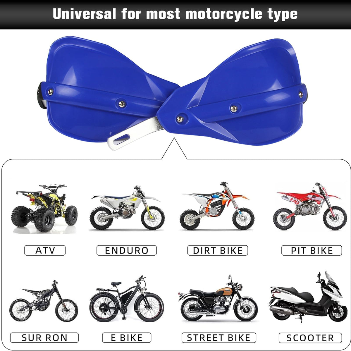 Feature: 100% Brand New, Never Mounted Efficiently Protect Hands While Driving Reduce Your Hands Or Fingers Fatigue Protect Your Hands From Brush, Rocks, Mud And Cold wind With Enough Room For Brake Cables Control And Other Devices Easy To Install Specification: Color:Blue as Pictures Material:PP Plastic and Aluminum Alloy Fitment: Universal Mounting Kits To Fit All Dirt Bikes, Enduro Fit All Handlebars Range 7/8' 22mm and 1 1/8' 28mm. Package Includes: A Set Of Hand Guards And Fitting Kit Installation Instruction NOT Included