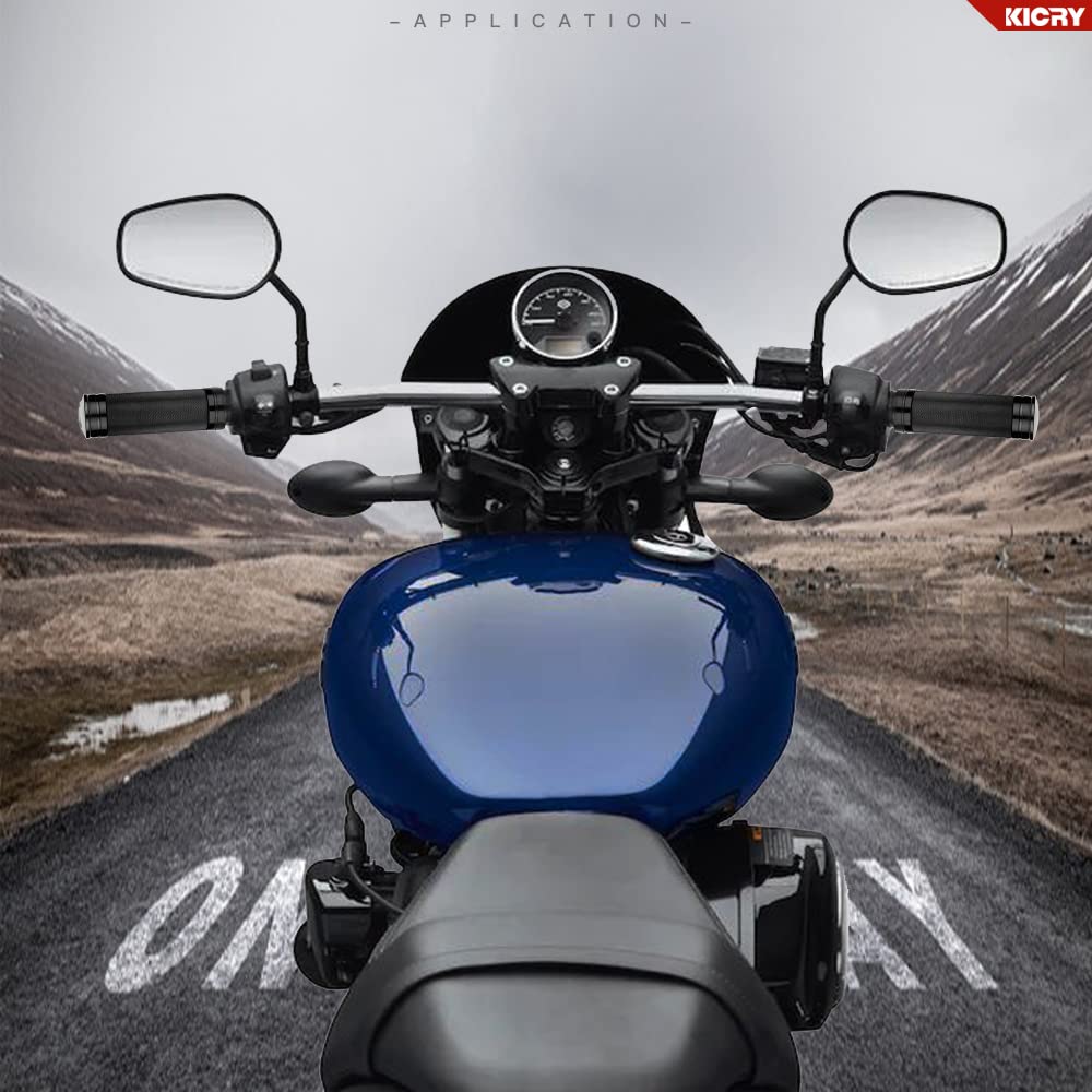 Q: What materials are used in the construction of these motorcycle grips?A: The KICRY Motorcycle Hand Grips are made from premium CNC billet aluminum, which offers durability and a stylish look. The grips feature a knurled surface for better grip and handling.