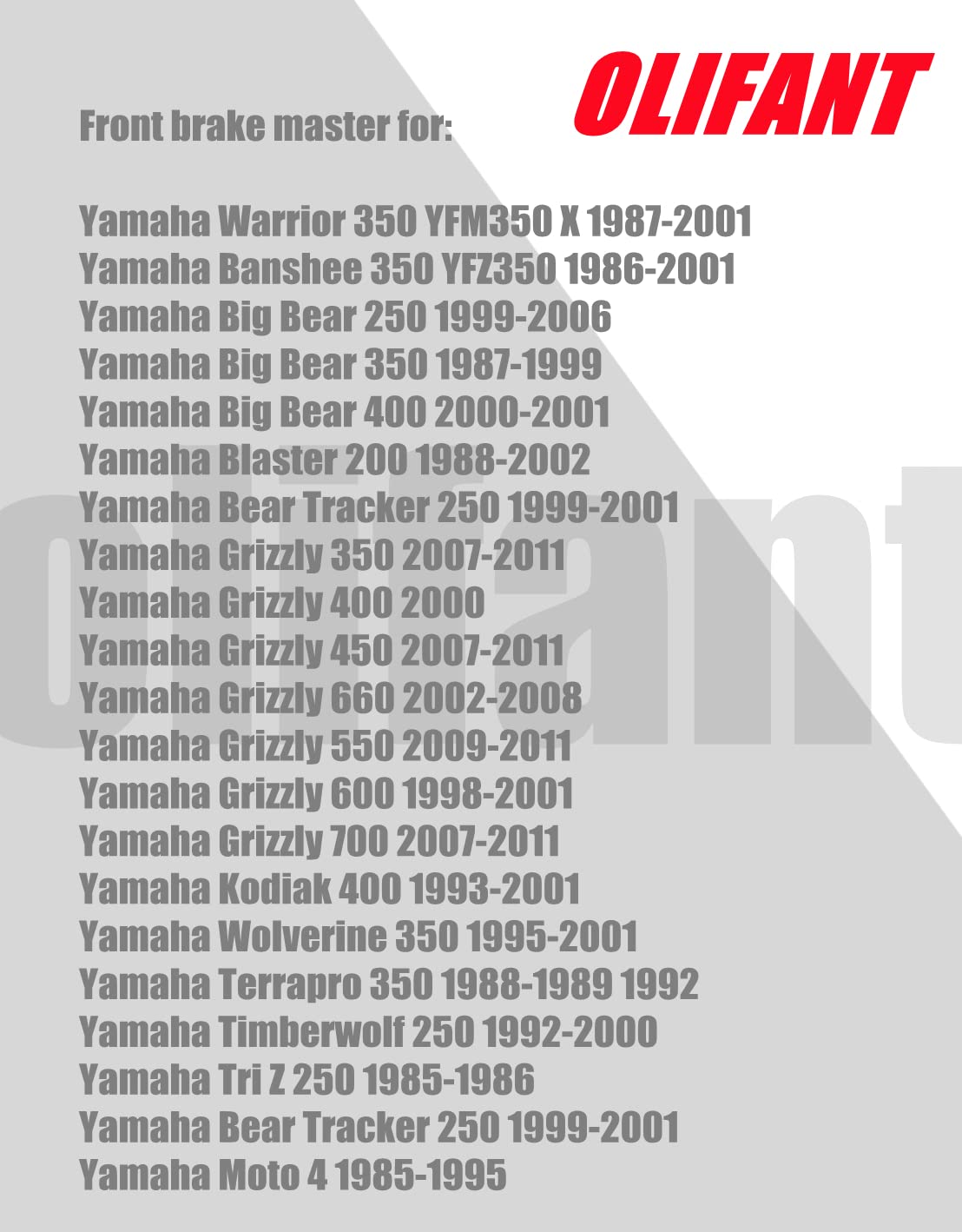 Q: Is the OLIFANT Front Brake Master Cylinder compatible with Yamaha Banshee models?A: Yes, the OLIFANT Front Brake Master Cylinder is compatible with Yamaha Banshee models, specifically the YFZ350 from 1986 to 2006.