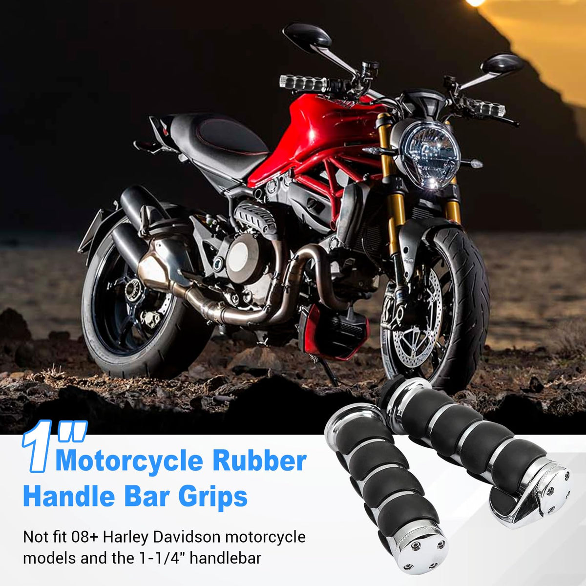 Q: What motorcycles are compatible with the OXMART Motorcycle Handle Grips?A: The OXMART Motorcycle Handle Grips are designed to fit most motorcycles, cruisers, motorbikes, and choppers with 1-inch handlebars. However, they are not compatible with specific Harley models like the Dyna Wide Glide 2006-2008, Fat Boy 2007-2011, and models with electrical throttle from 2008 onwards.