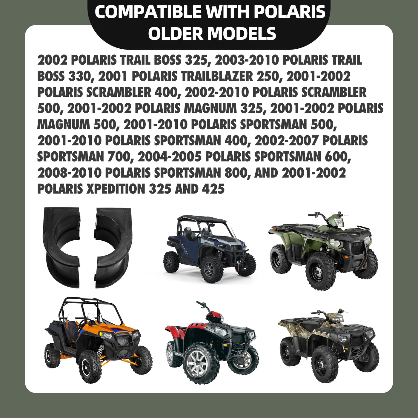 Q: Are these upper steering bushings compatible with older Polaris models?A: Yes, these upper steering bushings are compatible with several older Polaris models, including the 2002 Polaris Trail Boss 325, 2003-2010 Polaris Trail Boss 330, and others listed in the product details. They are designed to fit a wide range of Polaris Sportsman models from 2001 to 2016.