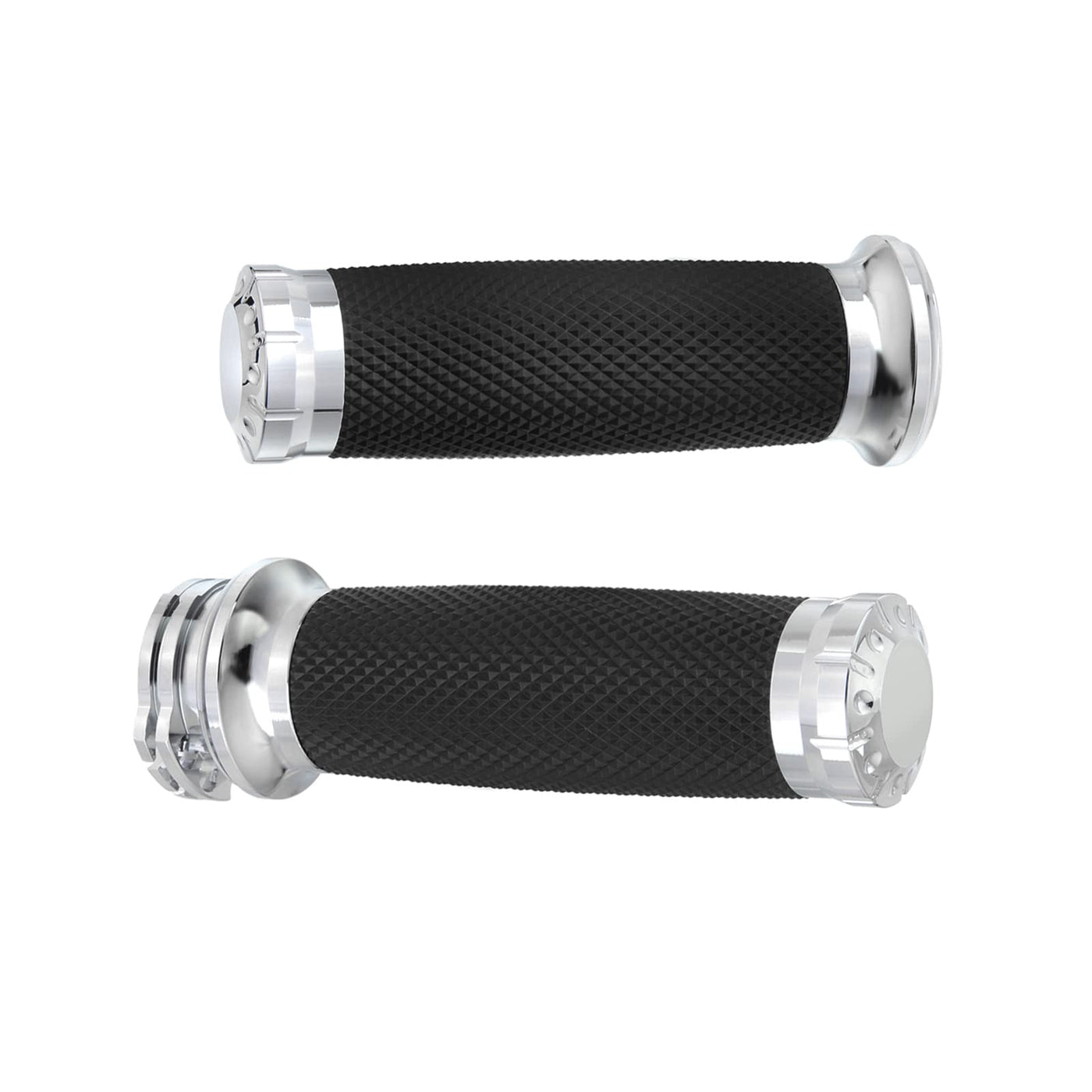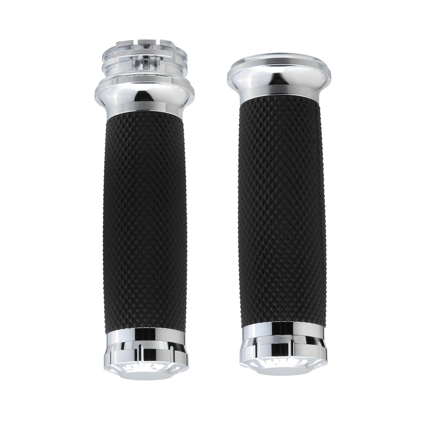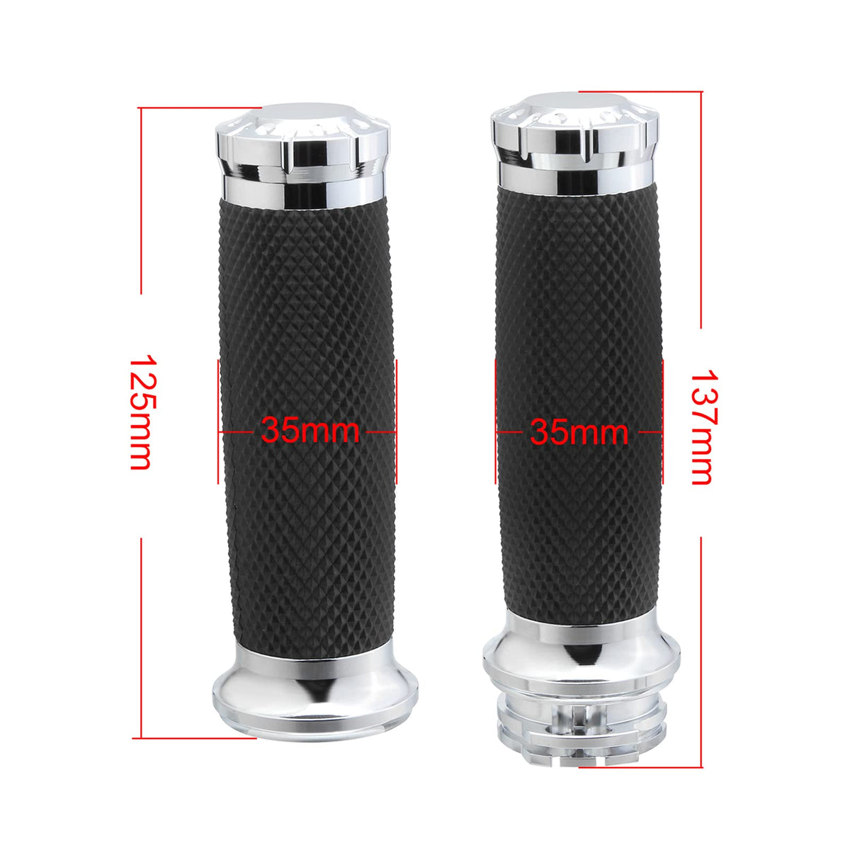 Specifications: Material: Aluminum & Rubber Inner Hole Diameter : 1 Inch. Right Size: 5.3''(about 135mm) Left Size: 4.75''(about125mm) Color: Chrome Position: Front, Right & Left FITMENT: Fit for Honda, for Yamaha, for Suzuki and for Kawasaki for Harley Cruiser with 1'' Handlebars(Both Left and Right). Fit for Harley Sportster, Dyna, Softail, Touring 1996-2017 with 1'' handlebars(both left and right). Notice: Please check the size of the products and ensure this part fit for your motorcycle before purchase. NOT FIT: Not fit Harley Dyna Wide Glide 2006-2008,Harley Fat Boy 2007-2011, Harley Screaming Eagle 2008-2011,Harley Davidson Heritage Softail Classic 1999, Harley Davidson Sportster 1200XLH 1994, 2011 Harley street glide, Honda GL,2005 Kawasaki Vulcan 2000. Will not fit the 1-1/4'' handlebar(on throttle side). Will not fit 08+ Harley Davidson motorcycle models with electrical throttle.