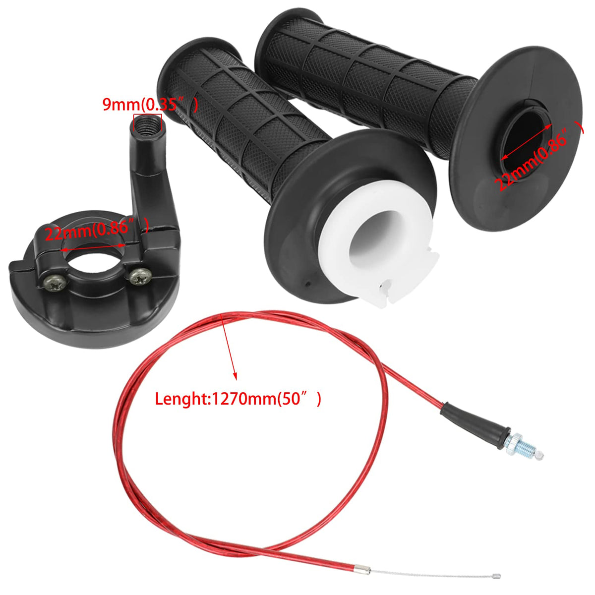 Size: The inner cable measures 50 inch/127cm and the outer conduit measures 45 inch/114cm.Fits for 7/8' ( 22mm) handle bar. ?Package Contents:? 1 pair Handle Grips, 1 x Red Throttle Cable, 1 x throttle housing clamp, 1 x On-Off Switch, 1 x Wrench, 6 x Tie.