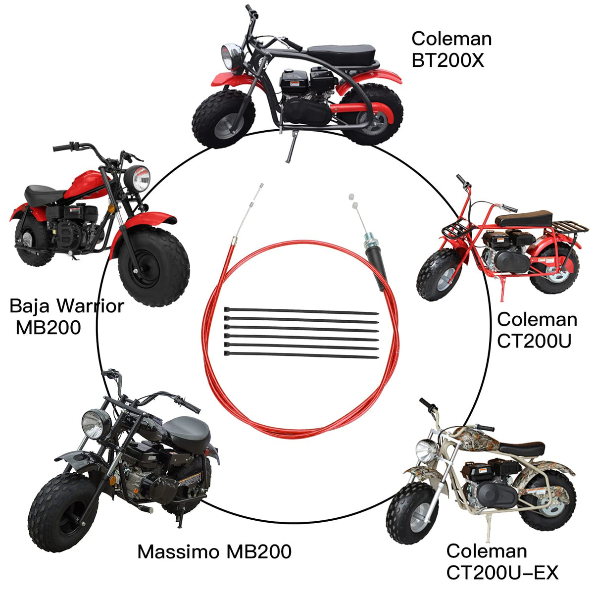 For 50cc 70cc 79cc 79.5cc 80cc 97cc 110cc 125cc 140cc 150cc 196cc 200cc 212cc 250cc 2.5hp 5.5hp 6.5hp coleman baja hensim massimo monster moto motovox mini bike go kart atv quad pit dirt bike Compatible with: /Coleman ct200u ct200u-ex bt200x/Baja MB165 & MB200 (Baja Heat, Mini Baja, Baja Warrior)/Baja Doodle Bug (Blitz, Dirt Bug, Racer,Viper) DB30/Massimo mb200/Falcon 200/Motovox mbx10 mbx11 mbx12/Monster moto (mmb80, american flag, muddy girl, real tree, class) /Hensim mini bike/ Size: The inner cable measures 50 inches/127cm and the outer conduit measures 45 inches/114cm. ?Package Contents:?1 x Throttle Cable, 6 x Tie.