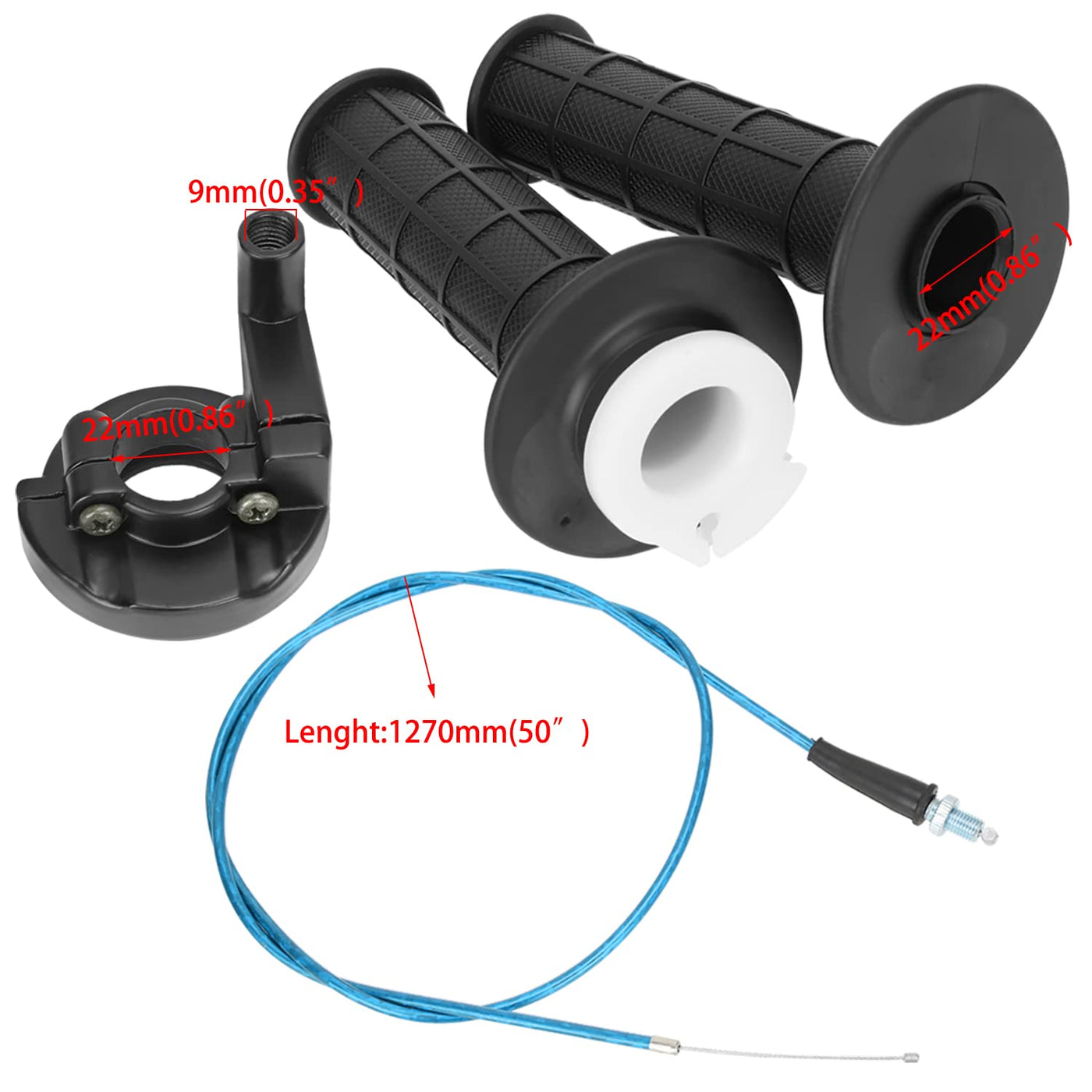 Size: The inner cable measures 50 inch/127cm and the outer conduit measures 45 inch/114cm.Fits for 7/8' ( 22mm) handle bar. ?Package Contents:? 1 pair Handle Grips, 1 x Blue Throttle Cable, 1 x throttle housing clamp, 1 x On-Off Switch, 1 x Wrench, 6 x Tie.