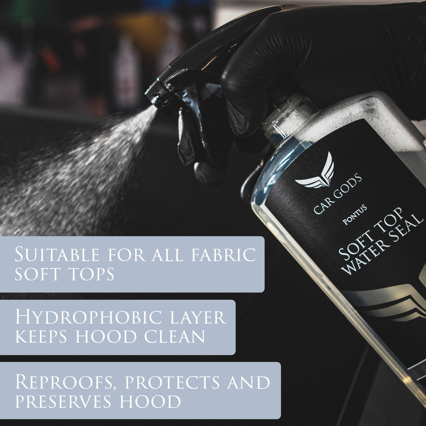 Q: How does the Car Gods Pontus Soft Top Water Seal work?A: The Car Gods Pontus Soft Top Water Seal creates a protective barrier on your soft top, utilizing a hydrophobic formula that repels dirt and water. This helps maintain the appearance and longevity of your convertible hood.