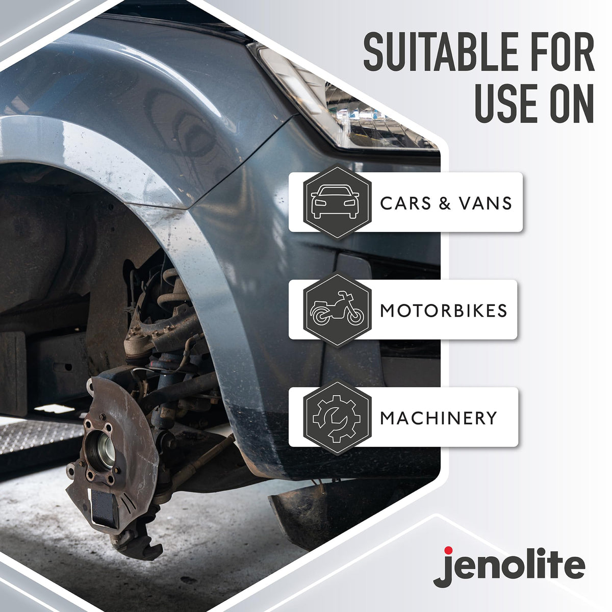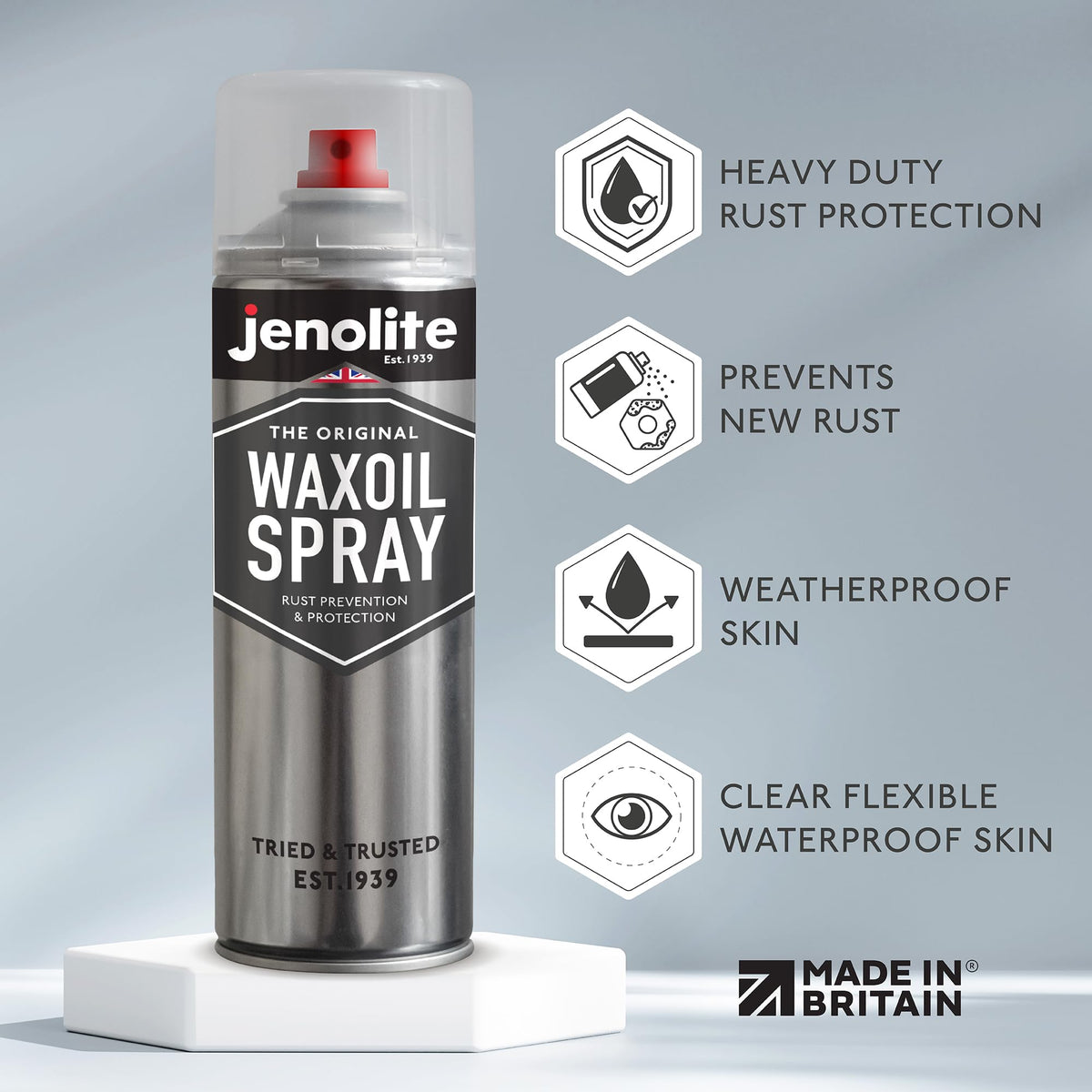 Jenolite Waxoil is a thick, waxy fluid, that is saturated with a powerful rust killer. The heavy-duty rust preventor kills off old rust and prevents new rust forming, providing long lasting rust protection for cars, vans, motorbikes and other equipment or machinery that is exposed to weather conditions. Quick and easy to apply, simply spray on to the surfaces to be protected and leave to work. The advanced formulation instantly chases out moisture and forms a clear, flexible, weatherproof skin that doesnt crack, dry out or wash off in the rain. Ideal for vehicle chassis, inner panels, box sections, wheel arches, etc. Advanced formulation stays active and if scratched or punctured will self-seal, and continue to provide the ultimate rust protection The perfect partner to our range of rust removers and converters.