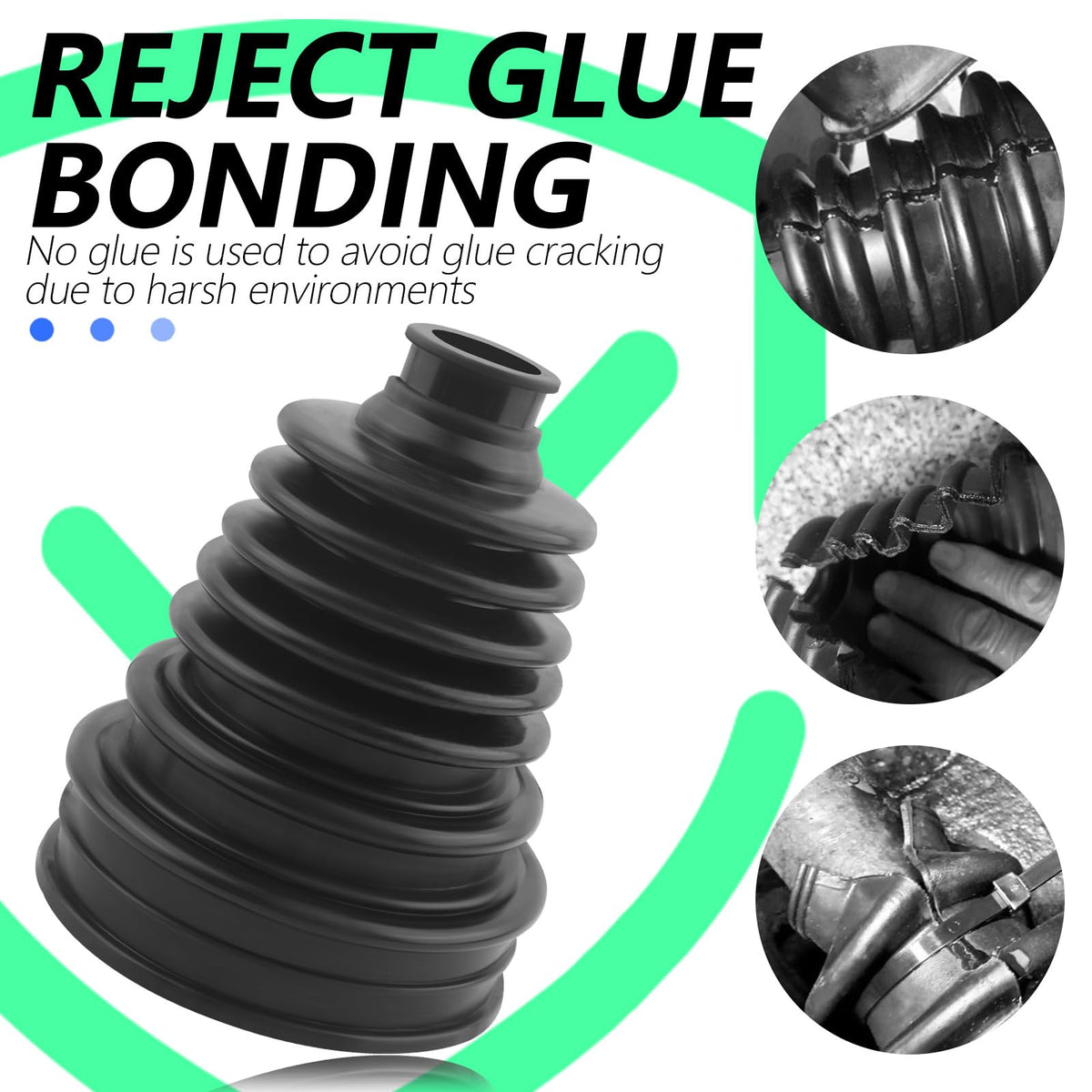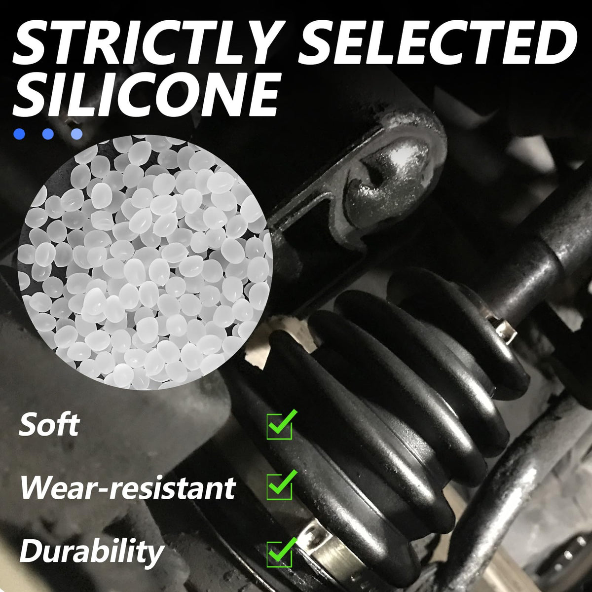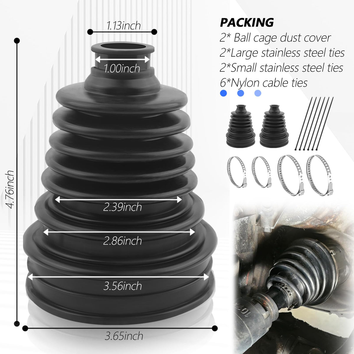 HIGH GRADE CV BOOT REPAIR KIT, DUSTPROOF AND WATERPROOF, PROLONGS THE LIFE OF DRIVE SHAFTSProduct AttributesColors: BlackSizes: 4.76 3.65 3.65 inchWeight: 8.26 ozMaterial: SiliconePackaging: 2 x CV Boots + 2 x Large Stainless Steel Clamp + 2 x Small Stainless Steel Clamp +6 x Nylon Cable TiesProduct Feature & Functions1. Adopting high elasticity rubber material, anti-wear, anti-tear, adapt to all kinds of bad road conditions, prolong service life2. Effectively avoid dust, mud and moisture, protect the ball cage joints and avoid grease leakage3. Reduces noise and vibration, improves driving smoothness, and makes every trip safer and more reliableStrongly Recommended: Before placing an order, please be sure to measure and check the size and caliber data of the product you need, to avoid mismatch after purchase (please allow a slight deviation in manual measurement data)Installation ProcedureApply Grease: Apply an appropriate amount of grease to the axle. Grease reduces friction, minimizes wear, aids heat dissipation, and avoids rust. Keep even application-avoid too much or too littleInstall Boot: Use a conical installation tool to carefully slide the new CV boot onto the axle, keeping full coverage. Pay attention to the boot's orientation-the larger end typically faces outward, and the smaller end faces inwardSecure Axle Boot: Use the included clamps or cable ties to firmly secure the boot to the car axle. Keep proper installation and tightening. Avoid over-tightening, which may loosen the boot, cause it to detach, or damage the axle