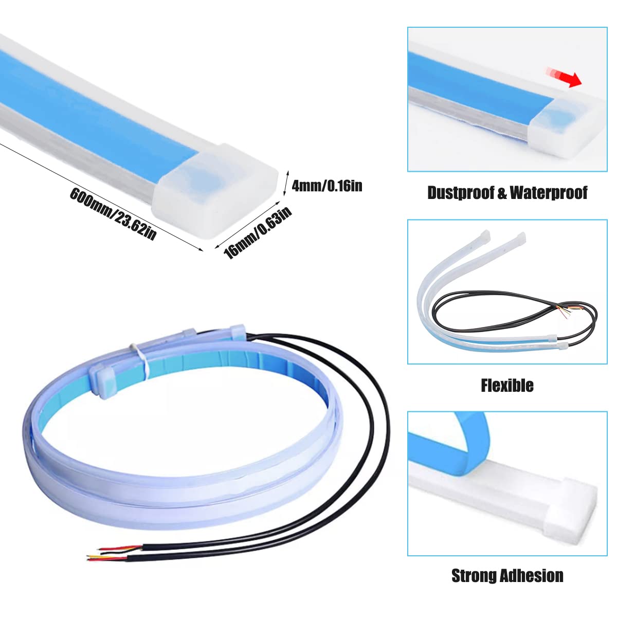 Q: What are the main features of the Car LED Strip Lights?A: The Car LED Strip Lights feature high-quality LEDs for enhanced brightness, flexibility for easy installation, and a dual-color function that transitions from white running lights to yellow turn signals. They are also waterproof with an IP68 rating, ensuring durability in various weather conditions.