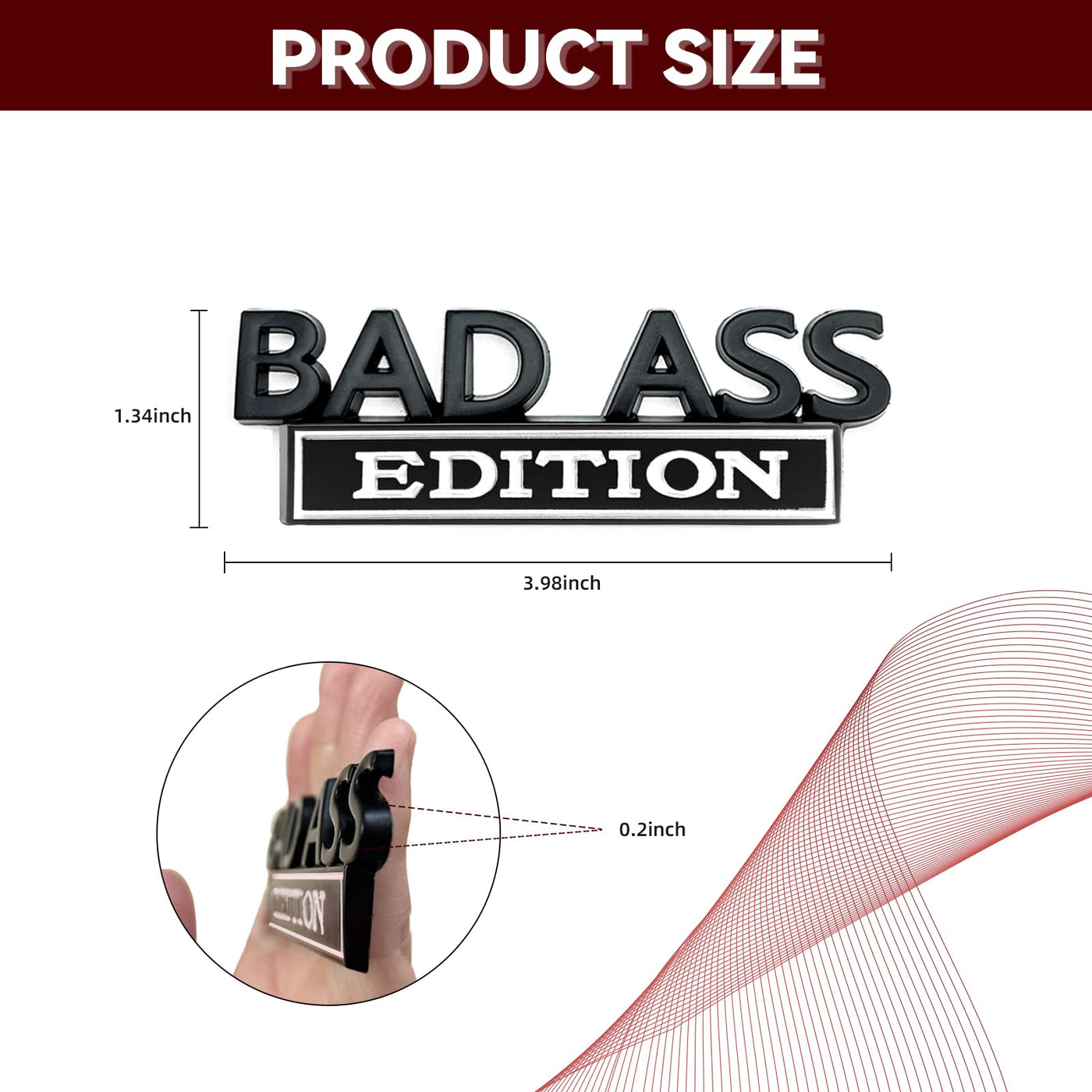 Q: What size is the BAD ASS Edition Emblem, and where can I use it?A: The BAD ASS Edition Emblem measures 3.98 inches in length, 1.34 inches in width, and has a thickness of 0.2 inches. Its compact size allows you to use it not only on cars but also on smooth surfaces like laptops, doors, or refrigerators for a personal touch.