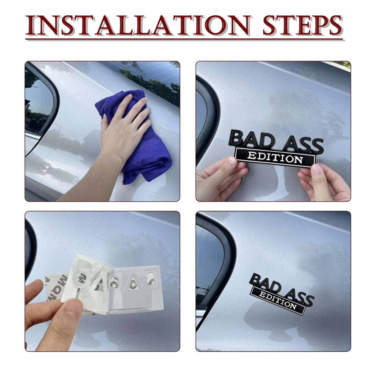 Q: How do I install the BAD ASS Edition Emblem on my car?A: Installation is simple and can be done without any tools. First, clean and dry the area where you want to place the emblem. Then, remove the protective film from the back of the logo. Align it with the desired spot and press it firmly to ensure it sticks well. Your installation will be complete.