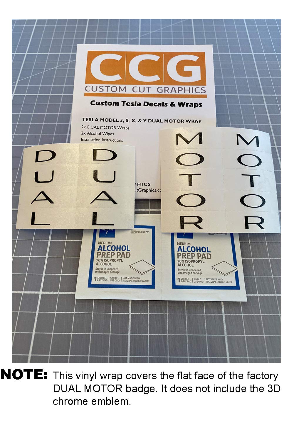 ***NOTE: The DUAL MOTOR wraps only cover the top flat surface of the badge. Chrome will still be visible around the raised edges.***Product Features:Includes 2 sets of decals: an extra set is included just in casePrecision design: perfect fit on the factory OEM DUAL MOTOR badge for the Tesla Model 3, S, X & Y (cannot guarantee fit on aftermarket badges)Commercial grade equipment: every cut is consistent, accurate, has smooth lines, and sharp cornersPrevium vehicle graphics vinyl: weather-rated; UV resistant; 8-year warrantyEasy installation: clear transfer tape is pre-applied for easy, quick, and accurate installation (about 10 seconds per letter); can be removed at any time90-day warranty & free replacements: we want your Tesla to look perfect, so we offer free replacements for 90-days for any reason, no questions asked Includes:(2) DUAL MOTOR vinyl wraps(2) Alcohol wipesInstallation instructions
