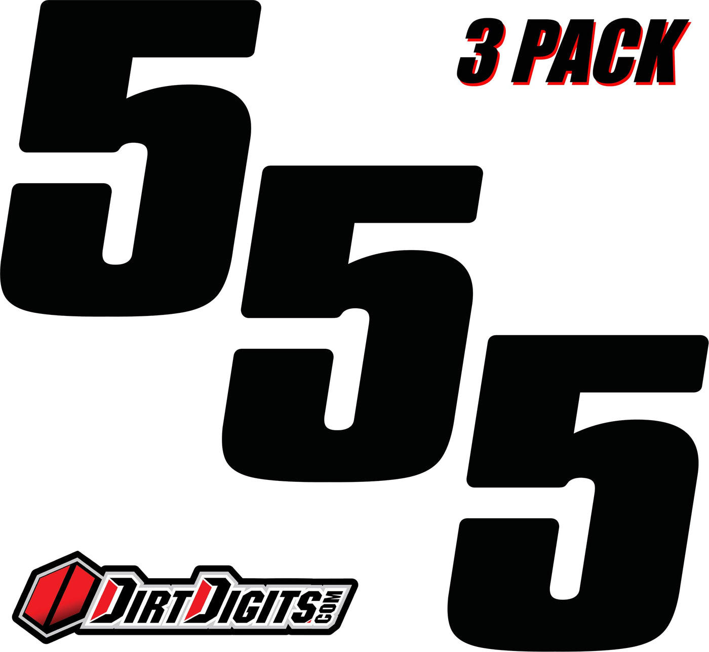 The numbers with style. Competition approved by the AMA. The Dirt Digit style motorsport numbers are manufactured out of thick high gloss vinyl. They feature a super aggressive adhesive which can be applied directly to motorcycle plastic plates and can be removed with virtually no residue left behind. Dirt Digits unique font allows them to fill the number plates perfectly on the newer style off-road motorcycles. They come packaged with three of the same number per package. Made in the USA.