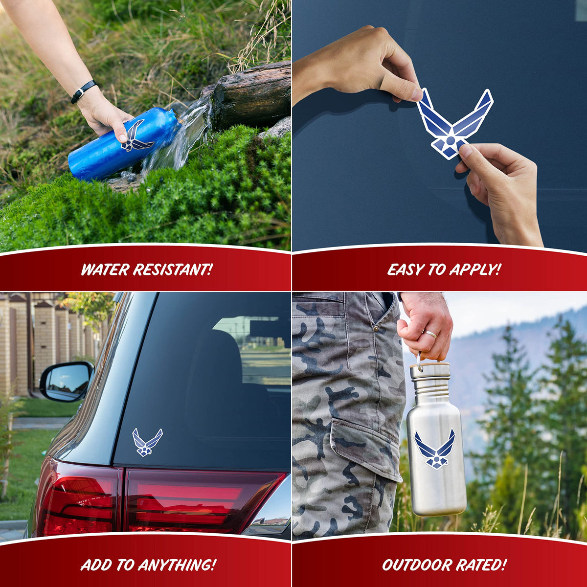 Our officially licensed US Air Force stickers and decals are the perfect decor for any proud United States military veterans car, phone, tablet, computer, or other smooth surface! Our USAF decal is also available for the United States Marine Corps, Navy, Army and Coast Guard. Our USAF decals for cars are created with top of the line materials that are guaranteed to stick to any smooth surface. The stickers are all weather proof and will withstand the harshest of climates and car washes. The Air Force window decals are easily removable without leaving unwanted residue. The permanent adhesive is one time use only and not reusable when removed. Our car decal military collection includes one large USAF sticker (sized 4 ), and three additional decals ranging in size from 1.75'' to 3 that make them perfect for a variety of surfaces. Licensed and approved by the US Air Force, an official holographic seal ensures license. Decalcomania only uses the highest quality materials that are made in the United States of America.