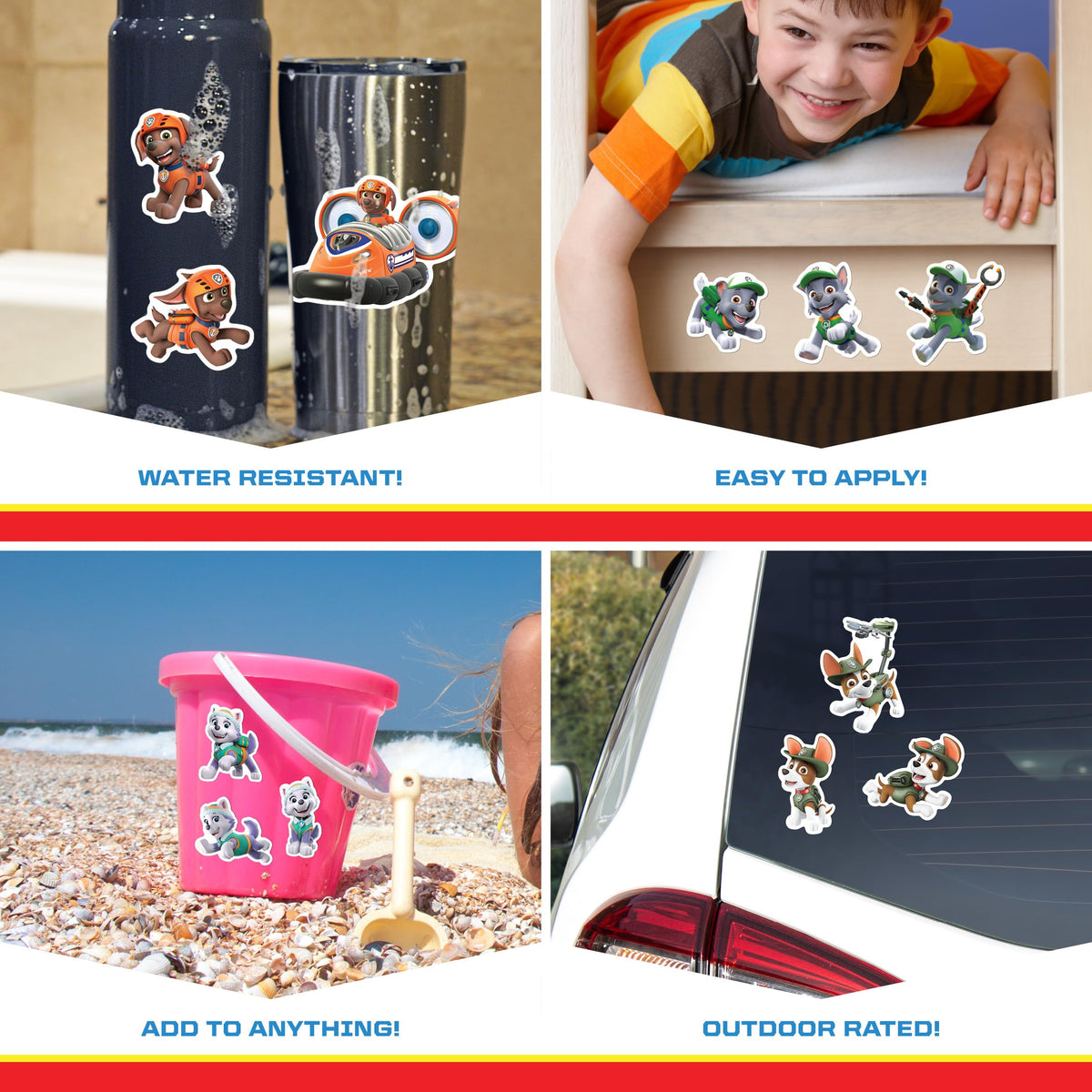 Bring the whole Paw Patrol team to life with this Value Pack of Decals featuring Rocky, Zuma, Tracker, and Everest. Each decal stands 3-4.5'' tall and captures the unique personality and heroics of these beloved characters. Whether youre decorating your water bottle, car, or favorite notebook, this set brings a touch of Paw Patrol fun to any surface. Made from durable outdoor-rated vinyl, these decals are designed to withstand exposure to sunlight, rain, and daily wear without fading or peeling. The easy peel-and-stick application ensures that anyone can customize their favorite items in seconds. From laptops to camping gear, these decals are perfect for fans of all ages and adventures of all kinds. Proudly made in the USA, this value pack is officially licensed by Nickelodeon, guaranteeing a high-quality and authentic product. Decalcomanias commitment to premium craftsmanship ensures that each decal pops with vibrant colors and detailed designs, making them a standout addition to your collection. Packaged in sleek retail packaging, this value pack makes an excellent gift for any Paw Patrol enthusiast. Whether its a special occasion or an everyday surprise, these decals celebrate the teamwork and charm of everyones favorite rescue pups.