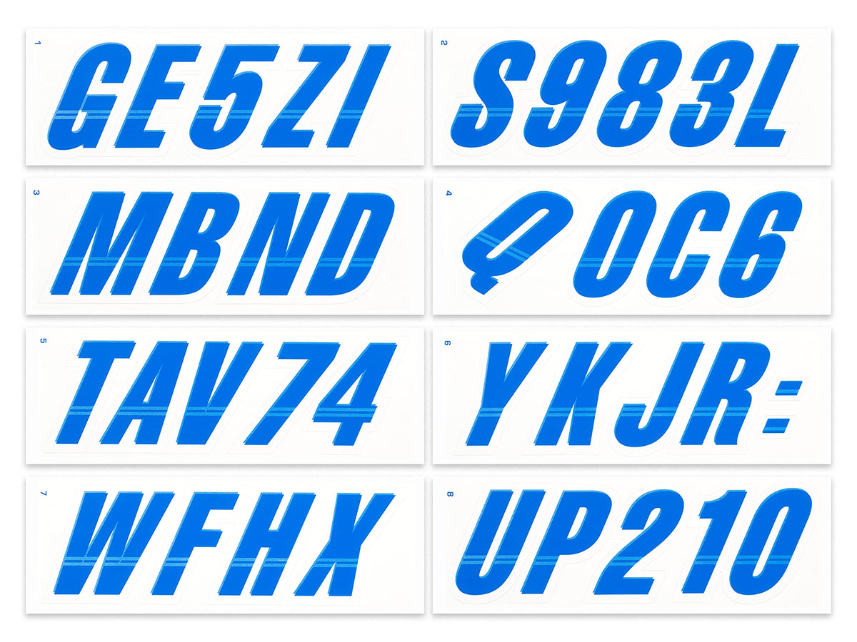 The Stiffie Techtron Alpha Numeric Identification Kit Has Filled The Void For A Racing Inspired Boat Registration Decal. This Styles Two-Color Design Features A Forward-Facing Slant With An Exterior Color Fade-In That Graduates From The Bottom Upward. Its Circle Track, Auto Racing Inspired Form Is The Basis Of The Individual Characters Which Are Set Off By An Interior Half Toned Highlight, Providing A 3-Dimensional Look. In Addition, The Stiffie Techtron Design Contains Two Interior Accent Stripes That Look Like They Were Carved Into The Face Of The Interior Character. This Registration Numbers Design Is Topped Off With A Heavy, Wide Body Exterior Outline Makes Overlapping The Individual Characters Very Easy And Enables You To Create A Unified, Custom Look Like Never Before. Who Said Your Marine Registration Stickers Must Be Boring? If You Are Looking For An Aggressive Style This Is The Boat Sticker Kit For You. The Stiffie Techtron Speed-Inspired Style Is Available In 112 Standard Colors And 23 Super-Sticky Colors For Use With Lse (Low Surface Energy) Plastic Surfaces Such As The Sea-Doo Spark, Inflatable Boats, Ribs And Hypalon/Pvc. Stiffie Boat Numbers Are 100% Manufactured In The Usa Using Our Color Clone Printing System. Stiffie Is The Only Registration Decal Manufacturer Offering True Color Matching For Your Oem Boat, Marine Vessel Or Personal Watercraft. Stiffie Alphanumeric Id Kits Are Marine Registration Stickers For All Water Vessels, Boats, Personal Watercraft. Our Decals Can Also Be Used For Dot Identifier Number Placement (Department Of Transportation), Snowmobile Registration, Or Any Application That Requires The Permanent Identification Or Marking Of Name Or Number. Our Decals Are Offered In Styles And Color Ways That Match Your Vessels Original Equipment Manufacturer (Oem) Color And Design Scheme. All Alphanumeric Id Kits Offered By Stiffie Come With Characters That Are 3 '' In Height And Meet Or Exceed Us Coast Guard Regulations. Every Id Kit Comes With 4 Sets Of 0-9 And A-Z Decals (146 Total Decals). Stiffie Alphanumeric Registration Decals Are Made To Withstand Contact With Chemicals, Fading, Curling, Tearing And Scratching. Stiffie Decals Are Also Uv Coated For Protection From Harmful Ultra-Violet (Uv) Rays. Application Is Easy; Just Peel Away The Decals From Their Backing And Apply. If You Are Not Sure Which Color Or Design Will Best Match Your Vessel, Please Give Us A Call.