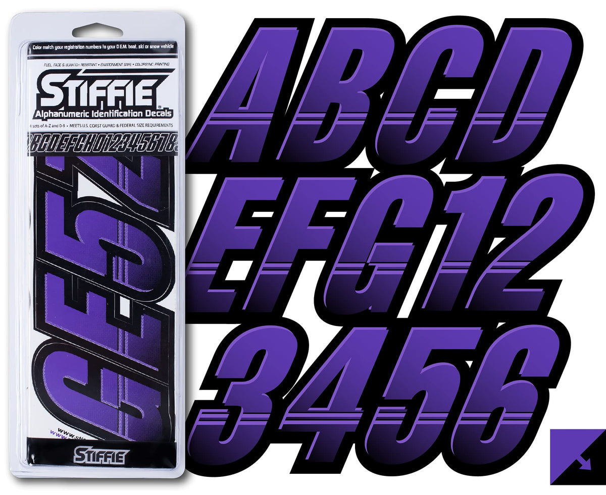 The STIFFIE Techtron Alpha Numeric Identification Kit has filled the void for a racing inspired boat registration decal. This styles two-color design features a forward-facing slant with an exterior color fade-in that graduates from the bottom upward. Its circle track, auto racing inspired form is the basis of the individual characters which are set off by an interior half toned highlight, providing a 3-dimensional look. In addition, the STIFFIE Techtron design contains two interior accent stripes that look like they were carved into the face of the interior character. This registration numbers design is topped off with a heavy, wide body exterior outline makes overlapping the individual characters very easy and enables you to create a unified, custom look like never before. Who said your marine registration stickers must be boring? If you are looking for an aggressive style this is the boat sticker kit for you. The STIFFIE Techtron speed-inspired style is available in 112 standard colors and 23 Super-Sticky colors for use with LSE (Low Surface Energy) plastic surfaces such as the Sea-Doo SPARK, Inflatable Boats, Ribs and Hypalon/PVC. STIFFIE boat numbers are 100% manufactured in the USA using our COLOR CLONE printing system. STIFFIE is the only registration decal manufacturer offering true color matching for your OEM Boat, Marine Vessel or Personal Watercraft. STIFFIE Alphanumeric ID kits are marine registration stickers for all water vessels, boats, personal watercraft. Our decals can also be used for DOT identifier number placement (Department of Transportation), snowmobile registration, or any application that requires the permanent identification or marking of name or number. Our decals are offered in styles and color ways that match your vessels original equipment manufacturer (OEM) color and design scheme. All Alphanumeric ID Kits offered by STIFFIE come with characters that are 3 '' in height and meet or exceed US Coast Guard Regulations. Every ID kit comes with 4 sets of 0-9 and A-Z decals (146 total decals). STIFFIE Alphanumeric registration decals are made to withstand contact with chemicals, fading, curling, tearing and scratching. STIFFIE decals are also UV Coated for protection from harmful ultra-violet (UV) rays. Application is easy; just peel away the decals from their backing and apply. If you are not sure which color or design will best match your vessel, please give us a call.