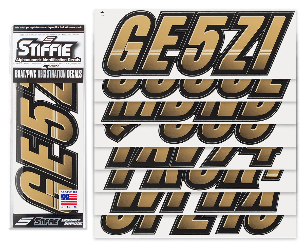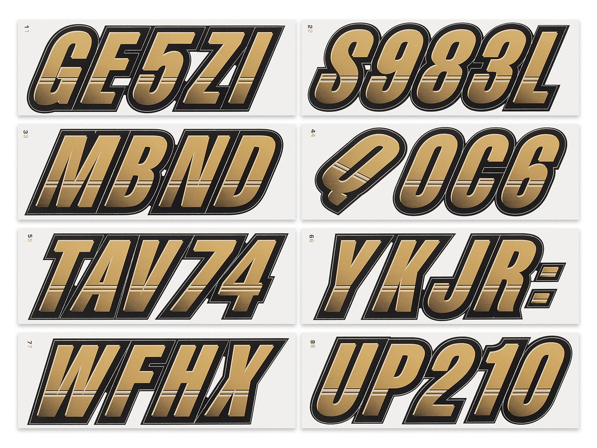 The STIFFIE Techtron Alpha Numeric Identification Kit has filled the void for a racing inspired boat registration decal. This styles two-color design features a forward-facing slant with an exterior color fade-in that graduates from the bottom upward. Its circle track, auto racing inspired form is the basis of the individual characters which are set off by an interior half toned highlight, providing a 3-dimensional look. In addition, the STIFFIE Techtron design contains two interior accent stripes that look like they were carved into the face of the interior character. This registration numbers design is topped off with a heavy, wide body exterior outline makes overlapping the individual characters very easy and enables you to create a unified, custom look like never before. Who said your marine registration stickers must be boring? If you are looking for an aggressive style this is the boat sticker kit for you. The STIFFIE Techtron speed-inspired style is available in 112 standard colors and 23 Super-Sticky colors for use with LSE (Low Surface Energy) plastic surfaces such as the Sea-Doo SPARK, Inflatable Boats, Ribs and Hypalon/PVC. STIFFIE boat numbers are 100% manufactured in the USA using our COLOR CLONE printing system. STIFFIE is the only registration decal manufacturer offering true color matching for your OEM Boat, Marine Vessel or Personal Watercraft. STIFFIE Alphanumeric ID kits are marine registration stickers for all water vessels, boats, personal watercraft. Our decals can also be used for DOT identifier number placement (Department of Transportation), snowmobile registration, or any application that requires the permanent identification or marking of name or number. Our decals are offered in styles and color ways that match your vessels original equipment manufacturer (OEM) color and design scheme. All Alphanumeric ID Kits offered by STIFFIE come with characters that are 3 '' in height and meet or exceed US Coast Guard Regulations. Every ID kit comes with 4 sets of 0-9 and A-Z decals (146 total decals). STIFFIE Alphanumeric registration decals are made to withstand contact with chemicals, fading, curling, tearing and scratching. STIFFIE decals are also UV Coated for protection from harmful ultra-violet (UV) rays. Application is easy; just peel away the decals from their backing and apply. If you are not sure which color or design will best match your vessel, please give us a call.