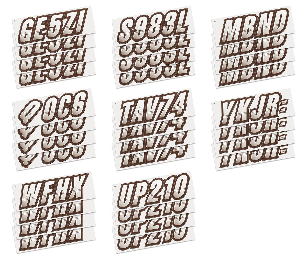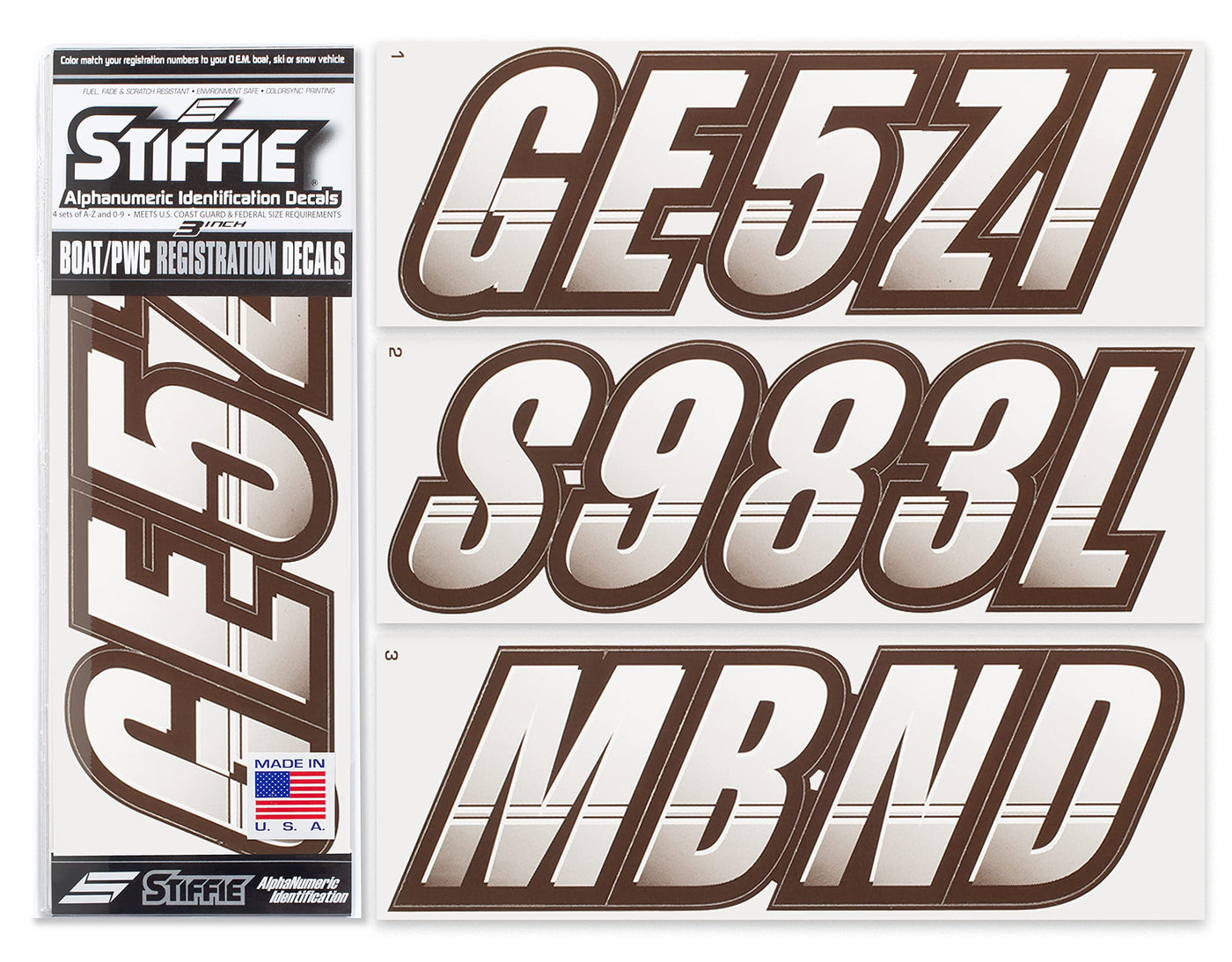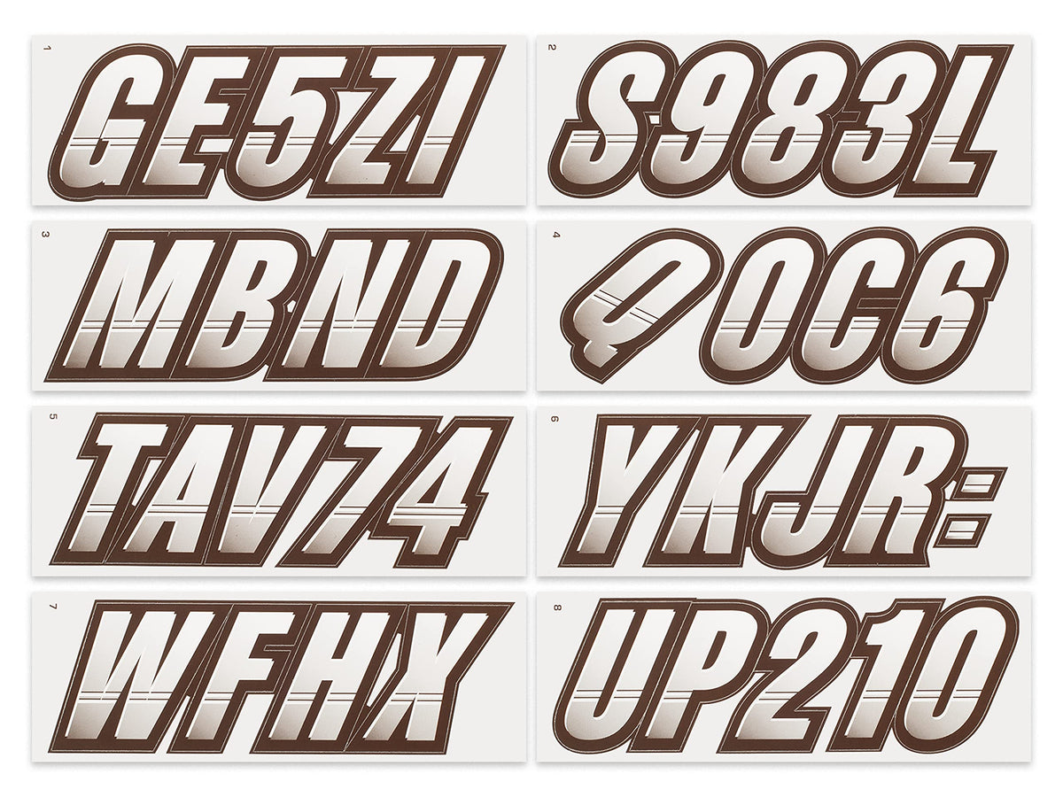 The STIFFIE Techtron Alpha Numeric Identification Kit has filled the void for a racing inspired boat registration decal. This styles two-color design features a forward-facing slant with an exterior color fade-in that graduates from the bottom upward. Its circle track, auto racing inspired form is the basis of the individual characters which are set off by an interior half toned highlight, providing a 3-dimensional look. In addition, the STIFFIE Techtron design contains two interior accent stripes that look like they were carved into the face of the interior character. This registration numbers design is topped off with a heavy, wide body exterior outline makes overlapping the individual characters very easy and enables you to create a unified, custom look like never before. Who said your marine registration stickers must be boring? If you are looking for an aggressive style this is the boat sticker kit for you. The STIFFIE Techtron speed-inspired style is available in 112 standard colors and 23 Super-Sticky colors for use with LSE (Low Surface Energy) plastic surfaces such as the Sea-Doo SPARK, Inflatable Boats, Ribs and Hypalon/PVC. STIFFIE boat numbers are 100% manufactured in the USA using our COLOR CLONE printing system. STIFFIE is the only registration decal manufacturer offering true color matching for your OEM Boat, Marine Vessel or Personal Watercraft. STIFFIE Alphanumeric ID kits are marine registration stickers for all water vessels, boats, personal watercraft. Our decals can also be used for DOT identifier number placement (Department of Transportation), snowmobile registration, or any application that requires the permanent identification or marking of name or number. Our decals are offered in styles and color ways that match your vessels original equipment manufacturer (OEM) color and design scheme. All Alphanumeric ID Kits offered by STIFFIE come with characters that are 3 '' in height and meet or exceed US Coast Guard Regulations. Every ID kit comes with 4 sets of 0-9 and A-Z decals (146 total decals). STIFFIE Alphanumeric registration decals are made to withstand contact with chemicals, fading, curling, tearing and scratching. STIFFIE decals are also UV Coated for protection from harmful ultra-violet (UV) rays. Application is easy; just peel away the decals from their backing and apply. If you are not sure which color or design will best match your vessel, please give us a call.