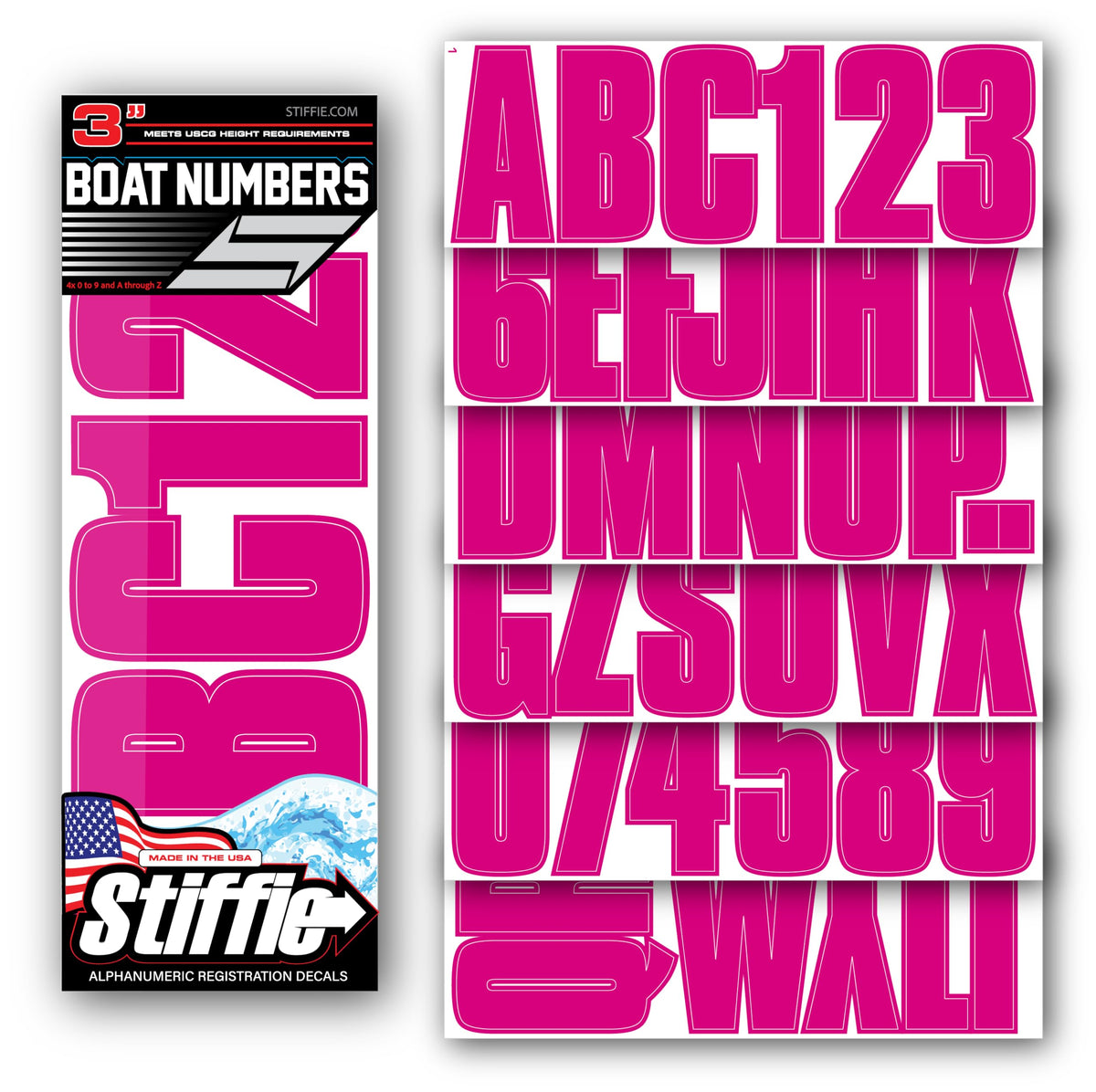 The STIFFIE Uniline Alpha Numeric Identification Kit is our original one-color design. It is a basic block style with a touch of flair. It has a semi-bold flavor with rounded corners and no slant. It is your standard one color kit at an economical low price. If visibility, definition, legality and economy are your number one concern, then this is the registration kit for you! STIFFIE decals are made to match your OEM Boat, Marine Vessel or Personal Watercraft using our COLOR CLONE print.