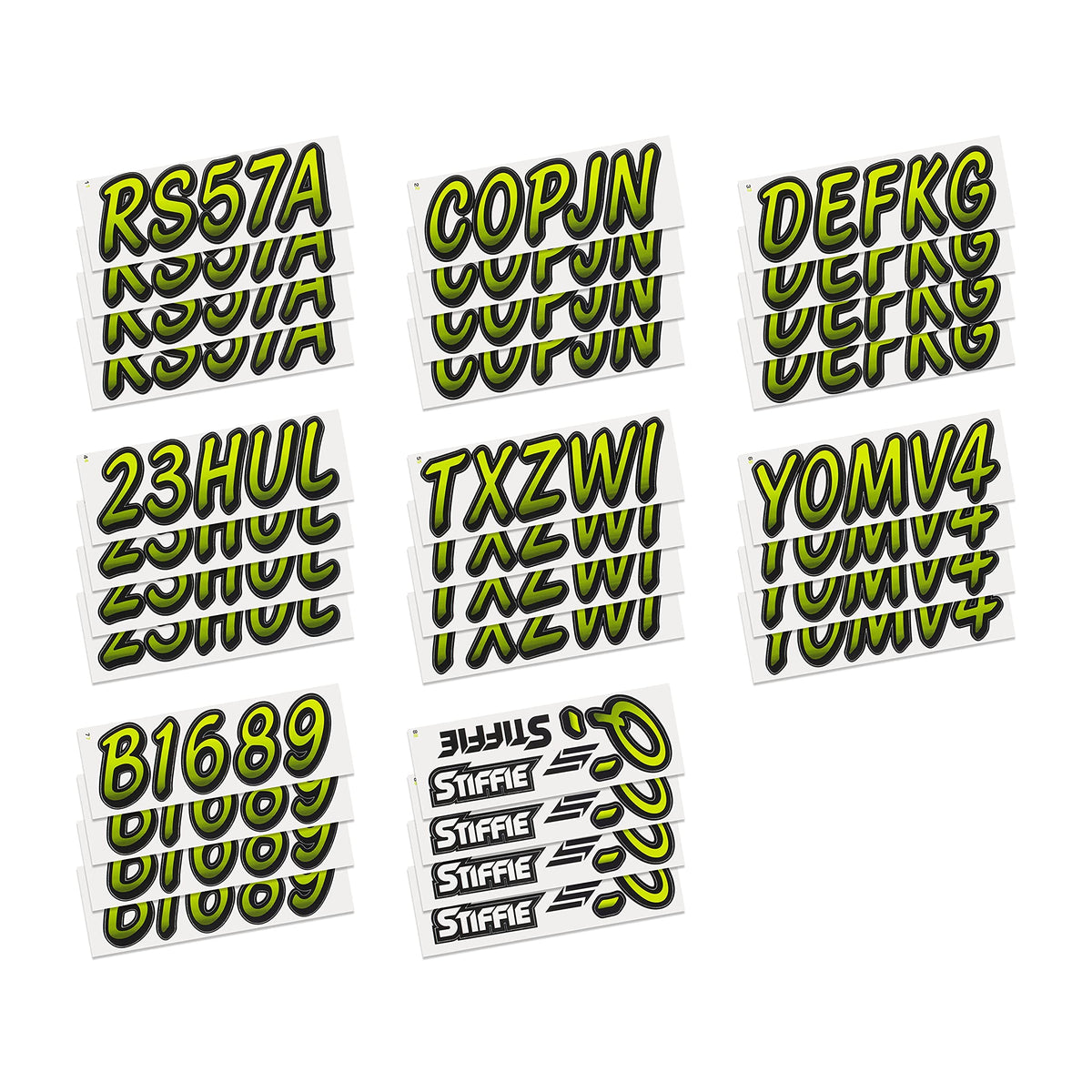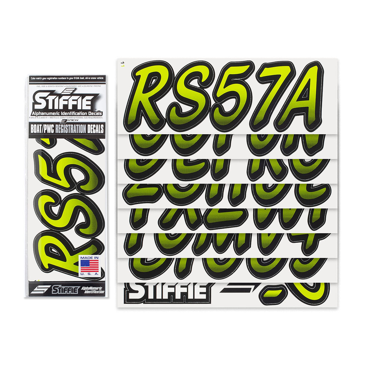 The STIFFIE Whipline Alpha Numeric Identification Kit remains our premiere boat registration numbers and letters decals style since 1992. It is a two-color design that features a forward-facing slant with smooth, rounded edges and a bold drop shadow type outline in a contrasting color. If style and cool factor is as important to you as functionality then this style is probably for you. The STIFFIE Whipline curvaceous style is available in 120 standard colors and 21 Super-Sticky colors for use with LSE (Low Surface Energy) plastic surfaces such as the Sea-Doo SPARK, Inflatable Boats, Ribs and Hypalon/PVC. STIFFIE boat numbers are 100% manufactured in the USA using our COLOR CLONE printing system. STIFFIE is the only registration decal manufacturer offering true color matching for your OEM Boat, Marine Vessel or Personal Watercraft. STIFFIE Alphanumeric ID kits are marine registration stickers for all water vessels, boats, personal watercraft. Our decals can also be used for DOT identifier number placement (Department of Transportation), snowmobile registration, or any application that requires the permanent identification or marking of name or number. Our decals are offered in styles and color ways that match your vessels original equipment manufacturer (OEM) color and design scheme. All Alphanumeric ID Kits offered by STIFFIE come with characters that are 3'' in height and meet or exceed US Coast Guard Regulations. Every ID kit comes with 4 sets of 0-9 and A-Z decals (146 total decals). STIFFIE Alphanumeric registration decals are made to withstand contact with chemicals, fading, curling, tearing and scratching. STIFFIE decals are also UV Coated for protection from harmful ultra-violet (UV) rays. Application is easy; just peel away the decals from their backing and apply. If you are not sure which color or design will best match your vessel, please give us a call.