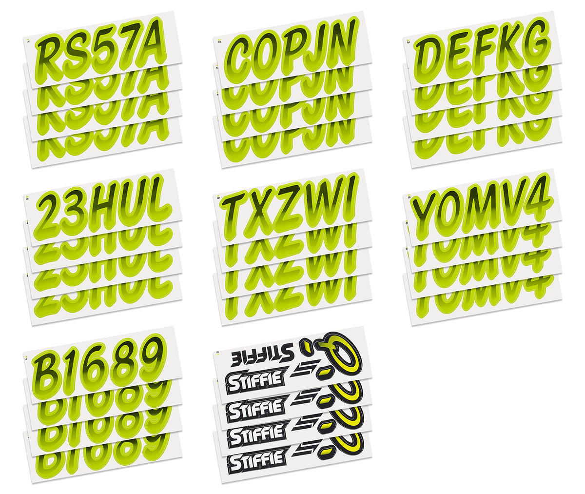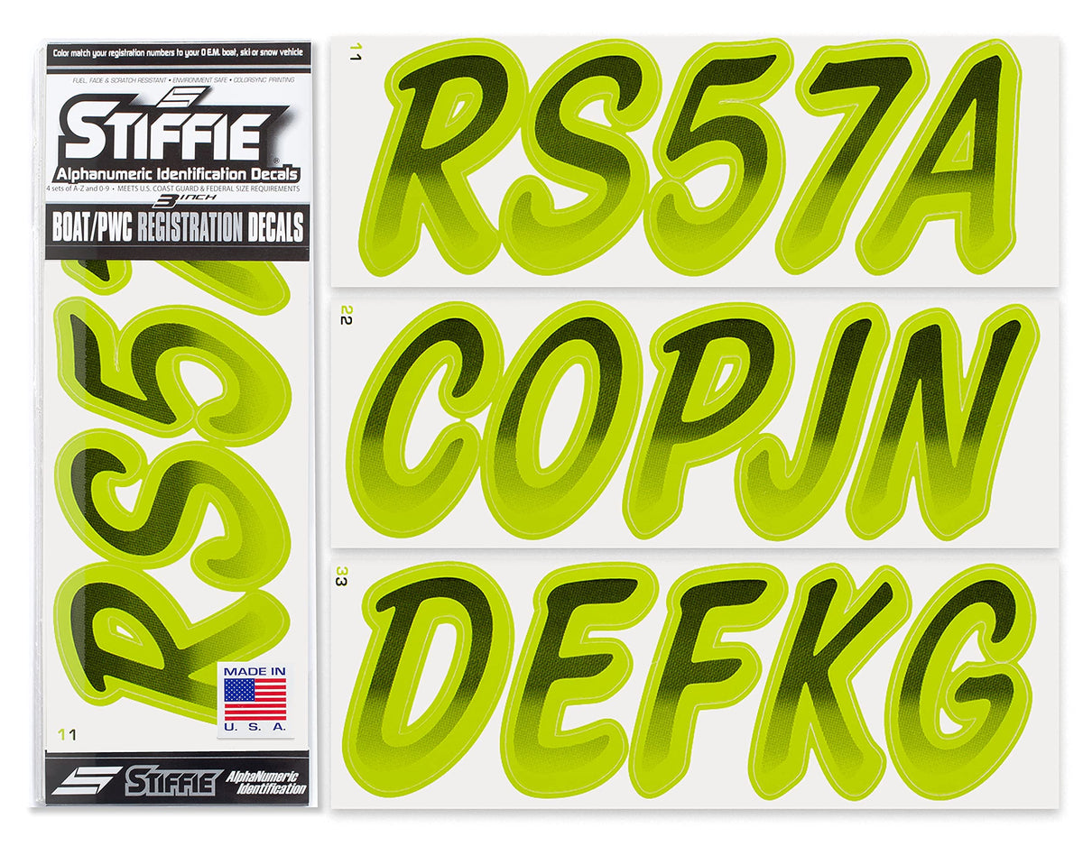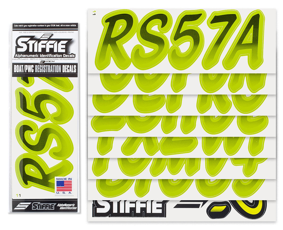 The STIFFIE Whipline Alpha Numeric Identification Kit remains our premiere boat registration numbers and letters decals style since 1992. It is a two-color design that features a forward-facing slant with smooth, rounded edges and a bold drop shadow type outline in a contrasting color. If style and cool factor is as important to you as functionality then this style is probably for you. The STIFFIE Whipline curvaceous style is available in 120 standard colors and 21 Super-Sticky colors for use with LSE (Low Surface Energy) plastic surfaces such as the Sea-Doo SPARK, Inflatable Boats, Ribs and Hypalon/PVC. STIFFIE boat numbers are 100% manufactured in the USA using our COLOR CLONE printing system. STIFFIE is the only registration decal manufacturer offering true color matching for your OEM Boat, Marine Vessel or Personal Watercraft. STIFFIE Alphanumeric ID kits are marine registration stickers for all water vessels, boats, personal watercraft. Our decals can also be used for DOT identifier number placement (Department of Transportation), snowmobile registration, or any application that requires the permanent identification or marking of name or number. Our decals are offered in styles and color ways that match your vessels original equipment manufacturer (OEM) color and design scheme. All Alphanumeric ID Kits offered by STIFFIE come with characters that are 3 '' in height and meet or exceed US Coast Guard Regulations. Every ID kit comes with 4 sets of 0-9 and A-Z decals (146 total decals). STIFFIE Alphanumeric registration decals are made to withstand contact with chemicals, fading, curling, tearing and scratching. STIFFIE decals are also UV Coated for protection from harmful ultra-violet (UV) rays. Application is easy; just peel away the decals from their backing and apply. If you are not sure which color or design will best match your vessel, please give us a call.