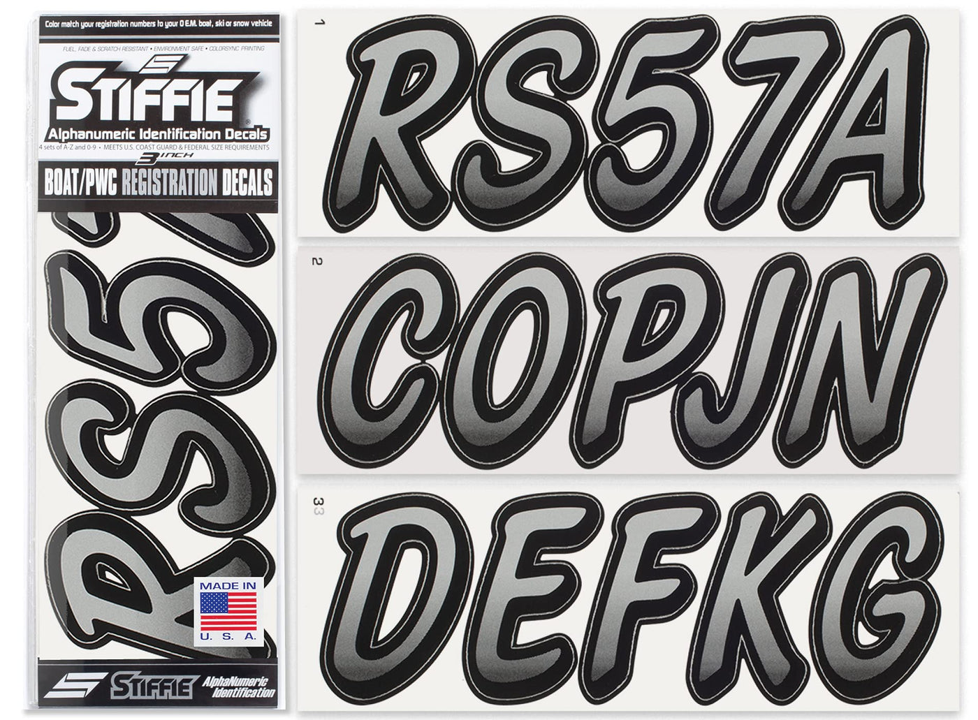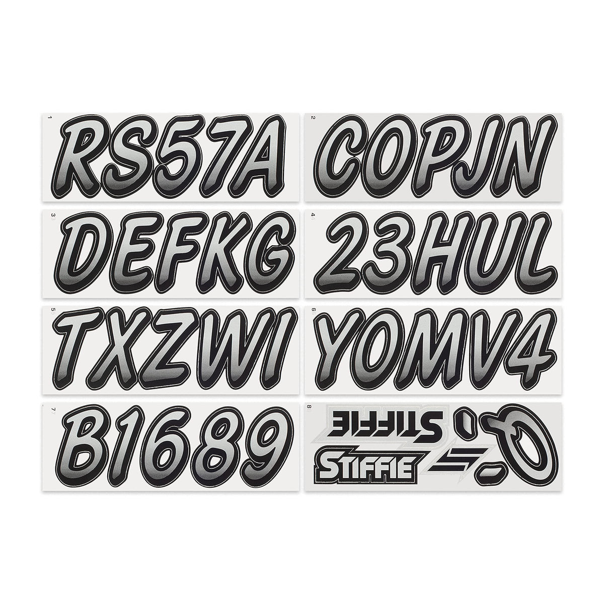 The STIFFIE Whipline Alpha Numeric Identification Kit remains our premiere boat registration numbers and letters decals style since 1992. It is a two-color design that features a forward-facing slant with smooth, rounded edges and a bold drop shadow type outline in a contrasting color. If style and cool factor is as important to you as functionality then this style is probably for you. The STIFFIE Whipline curvaceous style is available in 120 standard colors and 21 Super-Sticky colors for use with LSE (Low Surface Energy) plastic surfaces such as the Sea-Doo SPARK, Inflatable Boats, Ribs and Hypalon/PVC. STIFFIE boat numbers are 100% manufactured in the USA using our COLOR CLONE printing system. STIFFIE is the only registration decal manufacturer offering true color matching for your OEM Boat, Marine Vessel or Personal Watercraft. STIFFIE Alphanumeric ID kits are marine registration stickers for all water vessels, boats, personal watercraft. Our decals can also be used for DOT identifier number placement (Department of Transportation), snowmobile registration, or any application that requires the permanent identification or marking of name or number. Our decals are offered in styles and color ways that match your vessels original equipment manufacturer (OEM) color and design scheme. All Alphanumeric ID Kits offered by STIFFIE come with characters that are 3'' in height and meet or exceed US Coast Guard Regulations. Every ID kit comes with 4 sets of 0-9 and A-Z decals (146 total decals). STIFFIE Alphanumeric registration decals are made to withstand contact with chemicals, fading, curling, tearing and scratching. STIFFIE decals are also UV Coated for protection from harmful ultra-violet (UV) rays. Application is easy; just peel away the decals from their backing and apply. If you are not sure which color or design will best match your vessel, please give us a call.