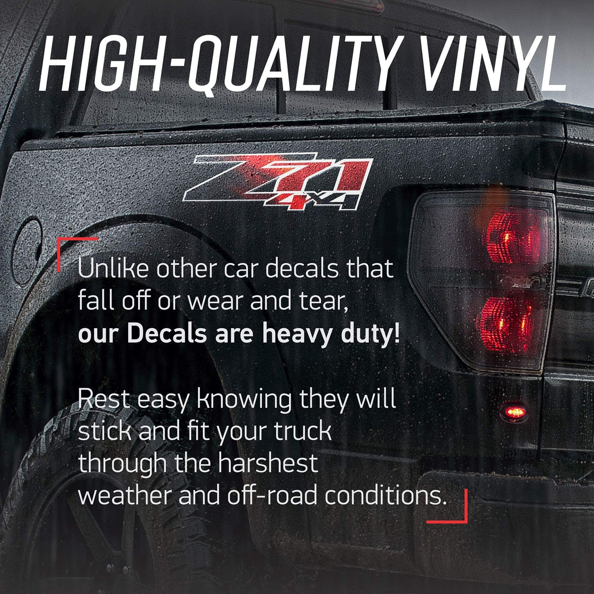 WHY CHOOSE GOLD HOOK Z71 4x4 DECAL?Made of the highest quality adhesive and vinyl materials, there truly is no other off-road replacement sticker like ours. As avid off-roaders ourselves, we know how important it is to take pride in your vehicle and to show off its capabilities. Customer service is one of our top priorities here at GOLD HOOK. We know that you will love this Z71 Off Road Decal, but if for some reason you dont, simply reach out to us and let us know. Our company will give you a prompt response and offer you a full refund and pay for your return shipping, no questions asked!EASY STICKER POSITIONINGThese vinyl decals were designed with an RS feature, which provides an ability to slide the sticker and position it wherever you please before permanently adhering it to your car or truck. NO WRINKLES OR BUBBLES We know the headache that other car decals can cause as you try to apply them to your car. That is why we have used the highest quality laminate, bubble-free vinyl when designing our Z71 decals.PRECUT & SIZED TO FITYou will not have to worry about cutting these decals or sizing them to fit your truck as they are ready to be applied right out of the box! The dimensions are 12.5'' x 4'' How to Apply Step 1. Completely clean and dry the desired application surface. Step 2. Carefully peel the backing paper from the decal at a sharp angle.Step 3. Align the decal and press it onto the desired surface. Firmly run a credit card across the transfer tape to make sure the decal adheres to the surface. Step 4. Slowly peel the transfer tape from the top of the decal. If any part of the decal starts to come up with the tape, run over that part of the decal with a credit card and try to peel the tape again.