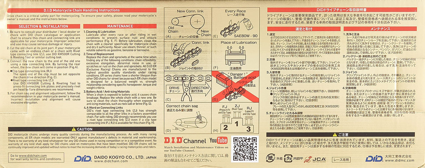 The D.I.D. Ert3 High Performance Racing Chain Has 25% Greater Anti-Shock Performance And A 5% Higher Tensile Strength Over The Previous Generation Ert2 Chain Without Increasing The Weight Of The Chain. The D.I.D. Ert3 Features An Exclusive Sdh Pin Treatment That Creates An Extremely Hard Chromium Carbide Layer On The Pin'S Surface While The Inner Core Is Maintained Soft To Absorb Extreme Shock Load. It Also Features Cold-Formed Solid Bushing Technology For High Wear Resistance And A Smooth Seamless Surface With Complete Roundness, Giving The Chain Exceptional Wear Life. Specs: Pin Length: 17.6Mm (0.693 In); Pin Diameter: 5.34Mm (0.21 In); Plate Thickness: In: 2.0 Mm, Out: 2.0 Mm; Weight (Per 100 Links): 1.36 Kg (2.99 Lbs.); Tensile Strength: 37.0 Kn (8, 300 Lbs.). Includes A Clip-Style (Rj) Master Link.