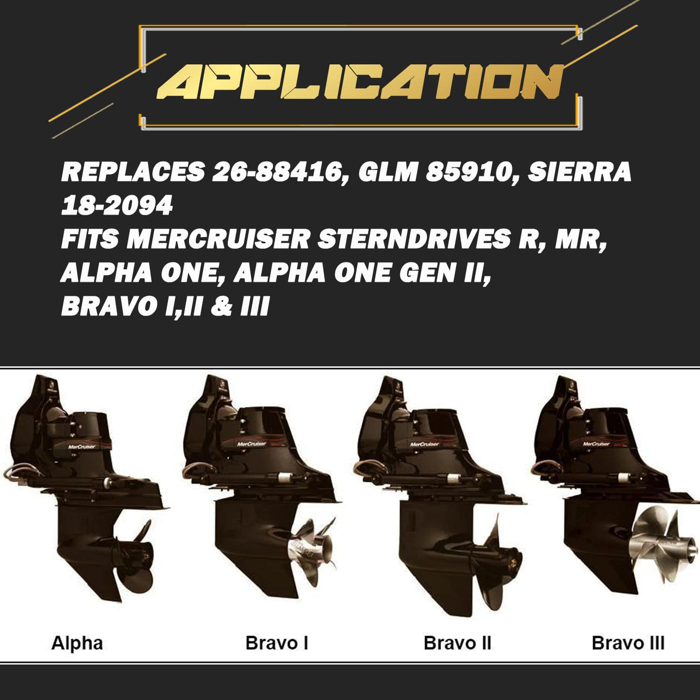 ??Perfect Replacement?: Replaces Mercruiser 26-88416, Glm 85910, Sierra 18-2094. | ??Great Compatibility?: Fits Mercruiser Stern Drives R, Mr, Alpha One, Alpha One Gen Ii, Bravo I,Ii & Iii. | ??Superior Material?: Made Of High Quality Nbr And Stainless Steel For Outstanding Wear Resistance, Great Sealing And Rust Resistance For Long-Lasting Reliability. Effective For Temperatures From -40°F To +250°F. | ??Function?: Preserves Life And Prevent'S Impurities From Entering The System. | ??100% Satisfaction Guarantee?: If You'Re Not 100% Satisfied With Our Items, Simply Return Them For A Fu-Ll Re-Fund In 30 Days. Support 12 Months War-Ran-Ty. Professional & Sincere Service Allows You To Take No Risks To Purchase In Camoo!
