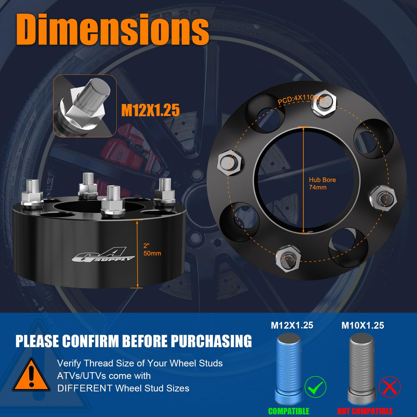 GAsupply 2'' 2inch 50mm 4x110 Black Wheel Spacers, Hub Bore 74mm 12x1.25 Studs, 2pack, Please confirm compatibility with your vehicle before purchasing.Only for vehicles with 4 110 Bolt Pattern, Hub Bore 74mm with 12 1.25 Studs. Package: 2pcs 4-110 wheel spacers and 1 Installation Instruction. Installation: When installing the 4x110mm wheel adapters & spacers, use a manual wrench for installation, not an impact wrench.