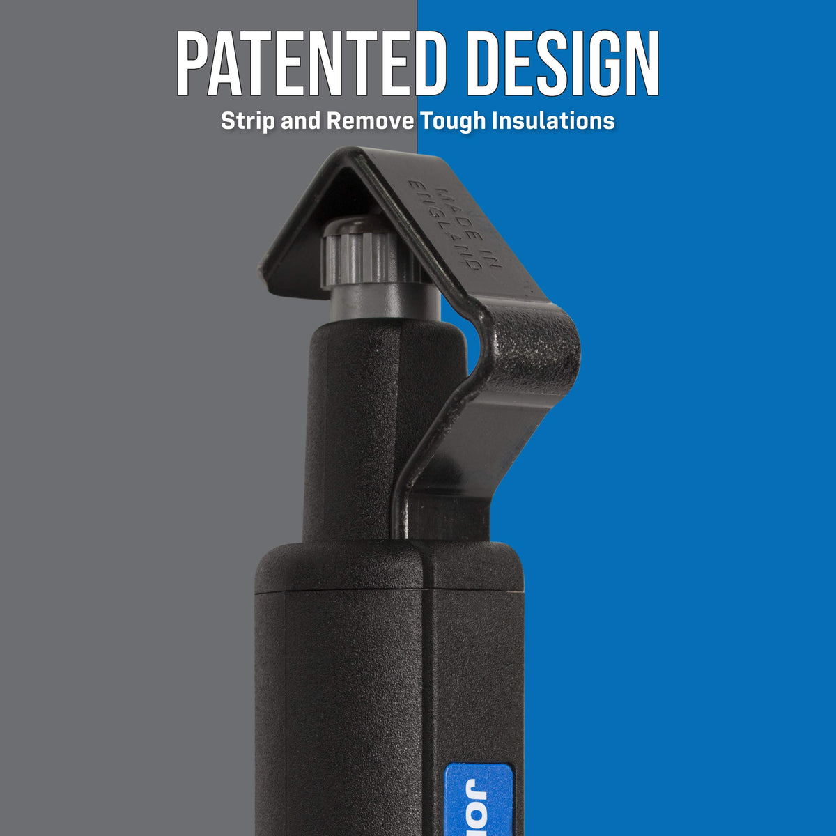 Q: What is the patented stripping mechanism and its benefits?A: The patented stripping mechanism of the Jonard CST-1900 provides a 'spiral stripping mode' which allows for efficient removal of tough insulations. This design helps in making precise cuts, including longitudinal, spiral, and circular cuts, enhancing the tool's functionality.