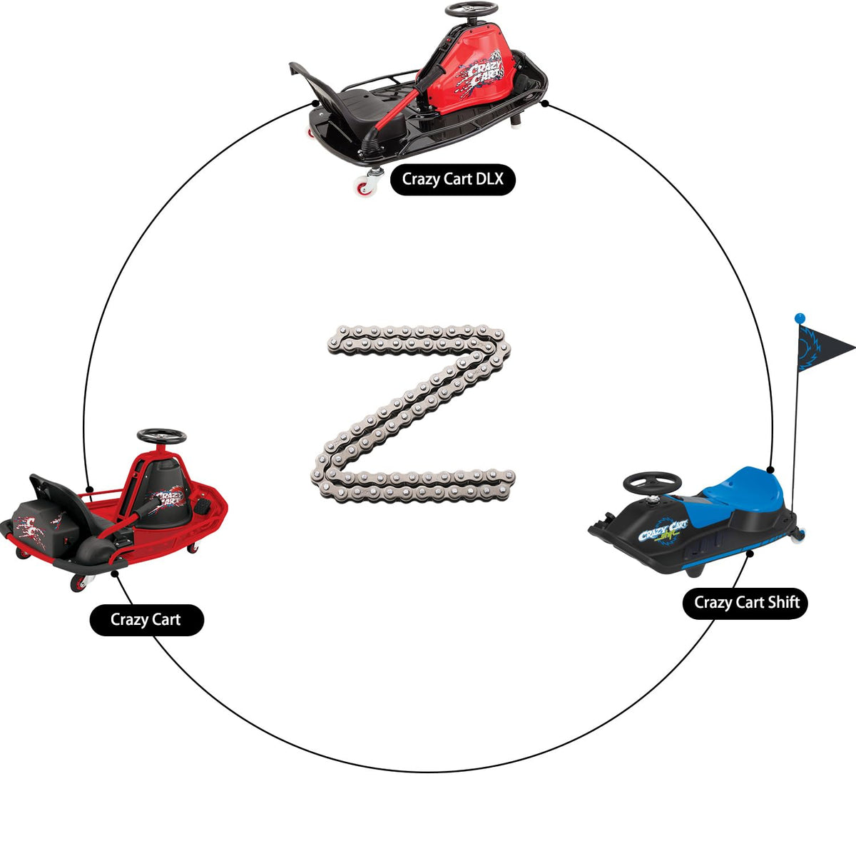 Q: What types of carts are compatible with the KAMIER #25 Roller Chain?A: The KAMIER #25 Roller Chain is compatible with Razor Ground Force Drifter Carts, including models such as Razor Crazy Cart, Razor Crazy Cart XL, Razor Crazy Cart DLX, and Razor Crazy Cart Shift.