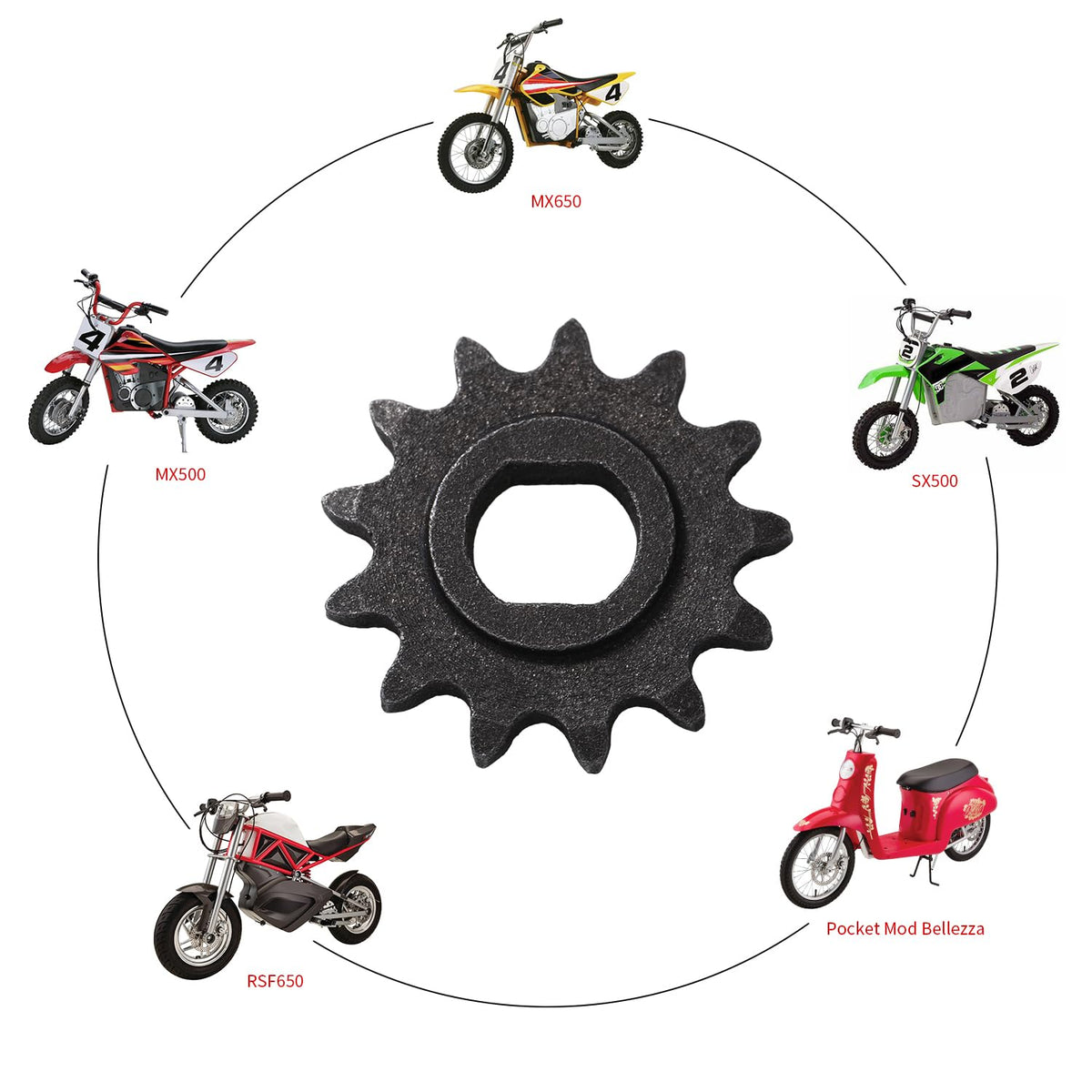 Q: What types of bikes are compatible with the KAMIER 25H Chain 13T Motor Sprocket?A: The KAMIER 25H Chain 13T Motor Sprocket is compatible with several Razor models, including the MX650 Dirt Rocket Bike, MX500 Dirt Rocket Bike, SX500 Mcgrath Dirt Rocket Bike, RSF650 Street Bike, and the 36V Motor Pocket Mod Bellezza Scooter.