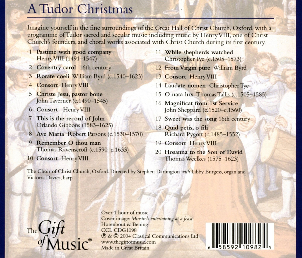 Q: What type of music is featured on the 'Tudor Christmas' album?A: The 'Tudor Christmas' album features a rich collection of traditional Christmas music, including both sacred and secular works from the Tudor period. It highlights compositions by renowned figures such as Henry VIII and choral pieces by Taverner and other notable composers associated with Christ Church.
