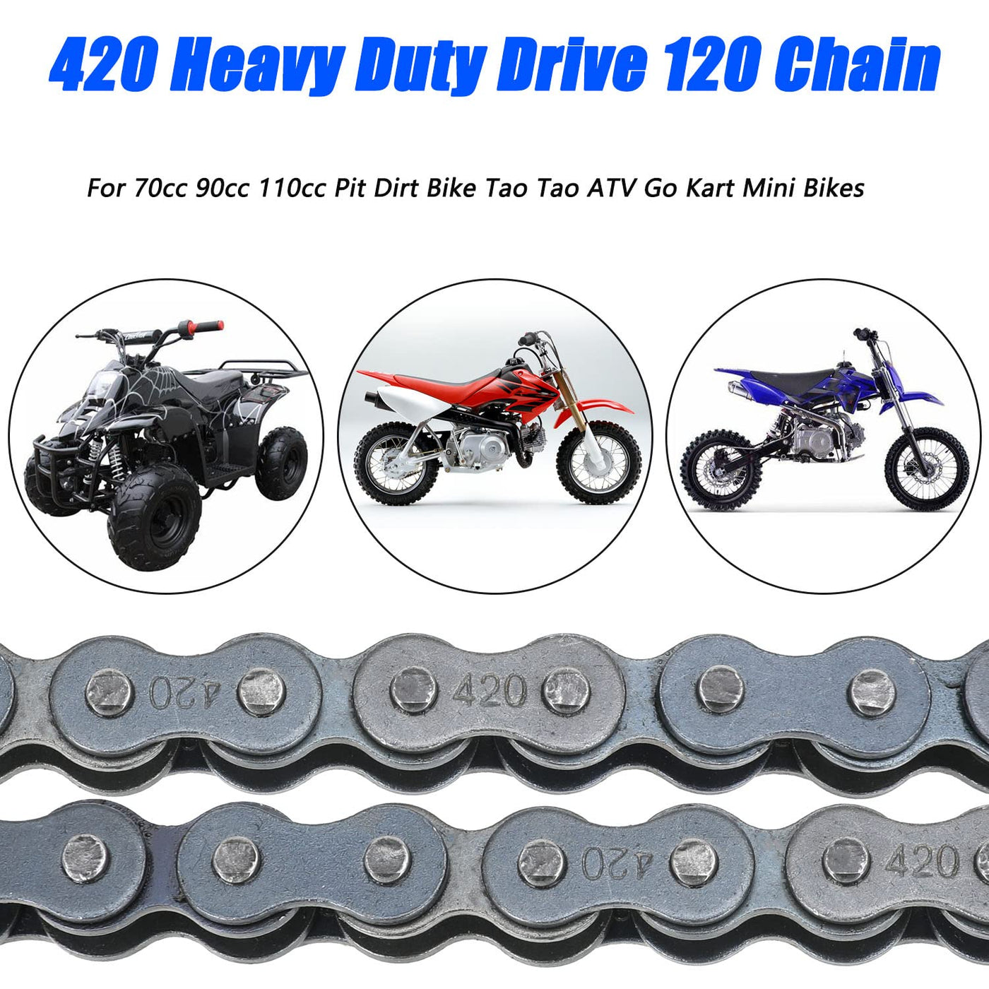 For 50cc 70cc 90cc 110cc 125cc CRF150 Grom YZ80 SSR KLX NST SDG TaoTao Coolster Apollo Kazuma Baja Lifan 4 Wheeler ATV Quad Go Kart Dirt Pit Mini Bike Compatible with:/Hond* CRF50, CRF70, CRF80, CRF110, CRF150, XR50, XR80, Grom, Rebel 250/SSR 125, SSR 125TR/Kawasak* KX65, KLX110/Yamah* yz80/2010 Zero DS/ Model:420 ; Material:Metal Easy to install, can be used to extend the existing 428 chain, using high-quality materials, fine processing, precision processing, strong, anti-oxidation, durable. Package includes: 1 x 420 Chain 120 Link. 5x 420 Connecting Master Link Professional after-sales: Please check the description to confirm the compatibility before purchase.