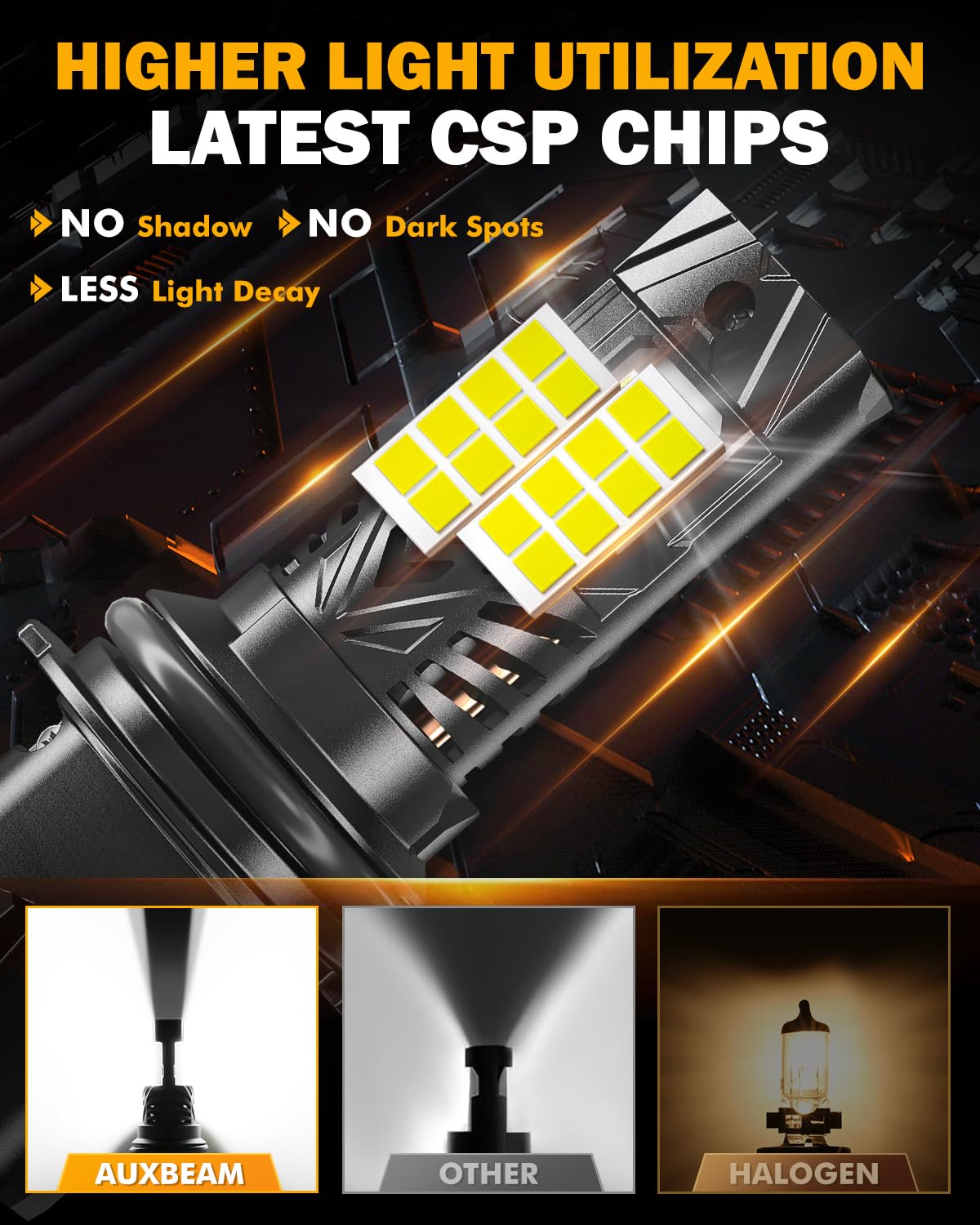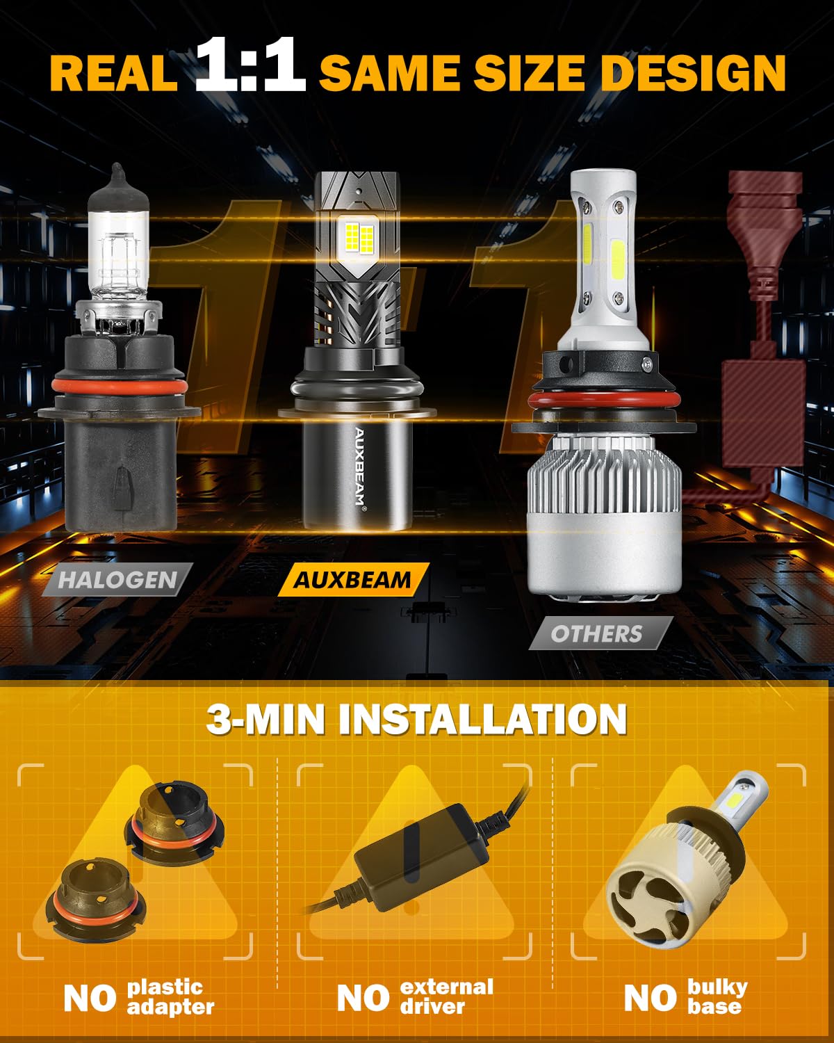 Q: What are the main benefits of using Auxbeam 9004 HB1 fog lights?A: Auxbeam 9004 HB1 fog lights provide 800% more brightness and 30,000 lumens of light output compared to traditional halogen bulbs, significantly improving visibility for safer driving in low-light conditions. The compact design ensures easy installation, and the advanced heat dissipation system extends the lifespan of the bulbs up to 60,000 hours.