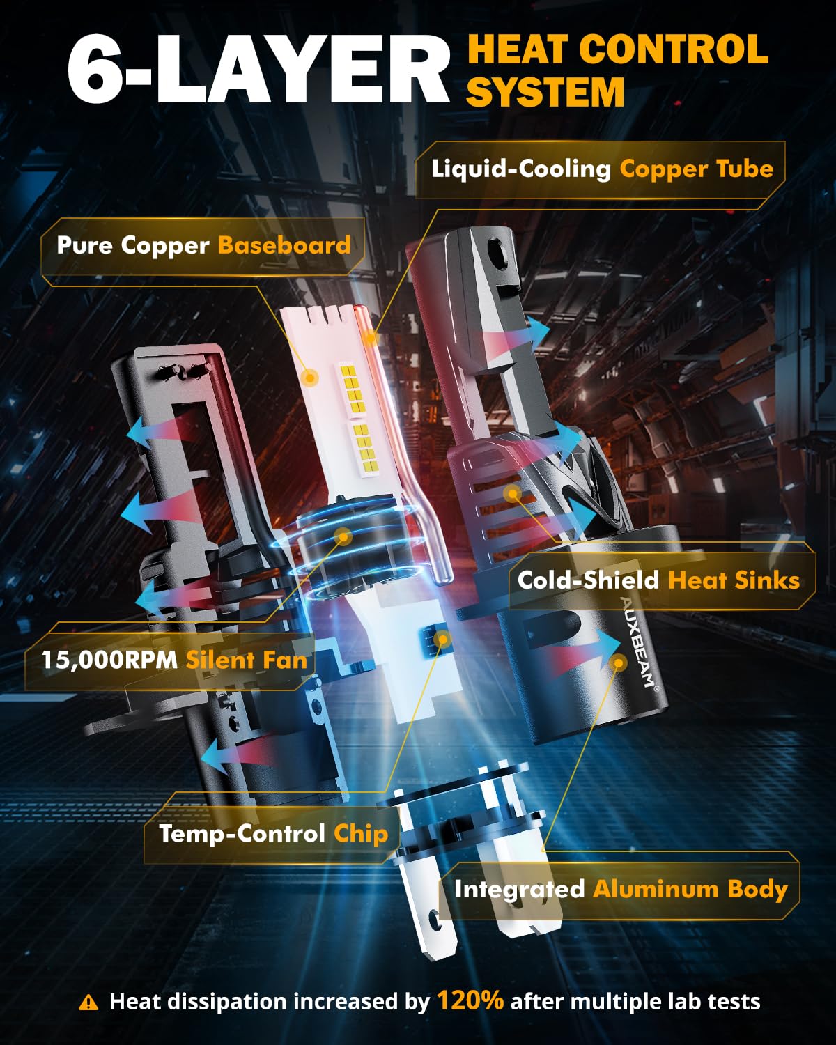 Q: What are the key features of the Auxbeam H4 9003 Fog Light?A: The Auxbeam H4 9003 Fog Light boasts a 1:1 OEM size for easy installation, a super bright output of 30,000 lumens with 800% more brightness than halogen lights, and a 6-layer heat control system that enhances heat dissipation, ensuring a lifespan of up to 60,000 hours.