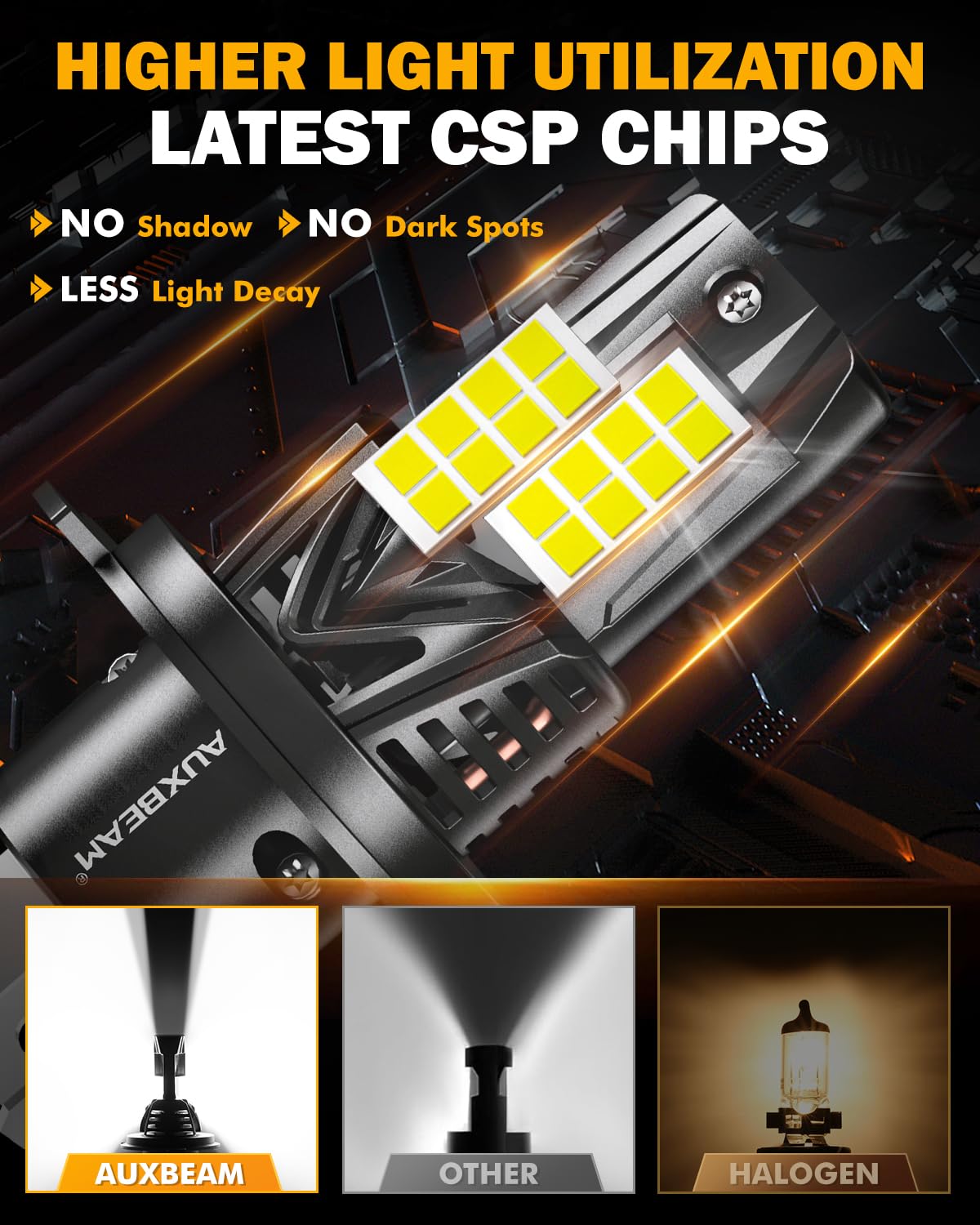 Q: How does the Auxbeam H4 9003 Fog Light compare to traditional halogen lights?A: The Auxbeam H4 9003 Fog Light provides significantly better visibility with 800% more brightness and 350% improved night vision compared to traditional halogen lights. Its unique beam pattern ensures no dark spots or blinding glare, making it safer for nighttime driving.