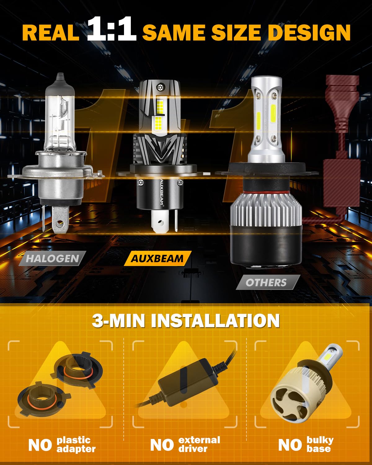 Q: How easy is it to install the Auxbeam H4 9003 Fog Light?A: Installation of the Auxbeam H4 9003 Fog Light is designed to be straightforward and can be completed in just 3 minutes. The all-in-one compact size allows for a real plug-and-play setup without the need for extra drivers or modifications.