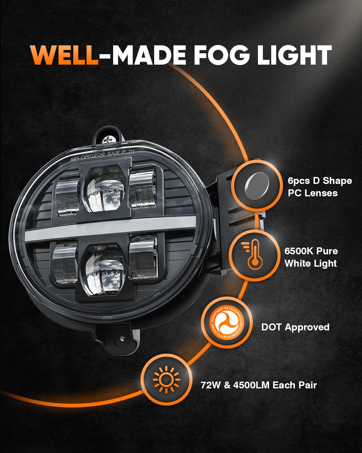 Q: What are the key features of the BICYACO LED Fog Light?A: Key features include a brightness of 4500 lumens per pair, IP67 waterproof rating, and a lifespan of up to 50,000 hours. The fog lights also come with daytime running lights (DRL) for enhanced visibility and safety.