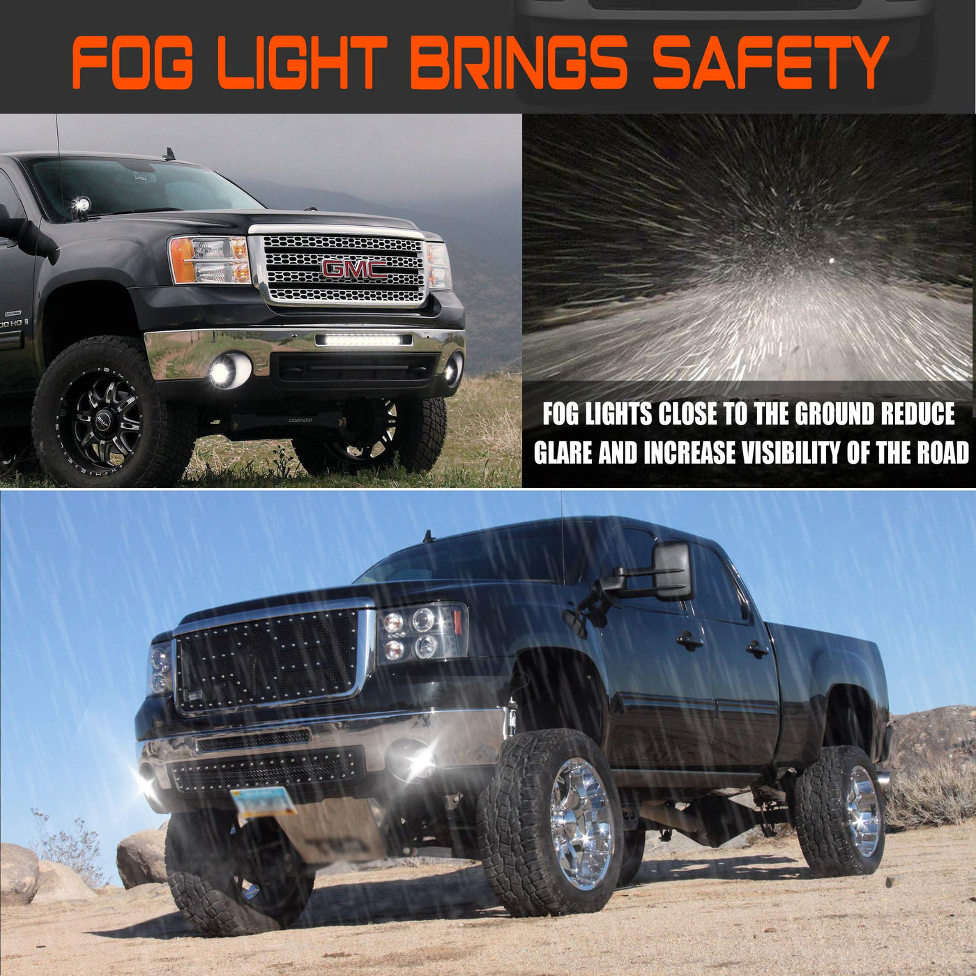 Fitment: 2007 2008 2009 2010 2011 2012 2013 Gmc Sierra 1500 / 2007 2008 2009 2010 2011 2012 2013 2014 Gmc Sierra 2500Hd / 2007 2008 2009 2010 2011 2012 2013 2014 Gmc Sierra 3500Hd &Nbsp; Specification: Voltage:&Nbsp;12V Ip: 67Certification: Dot/Sae Compliance Lens Material: Pc Housing Material: Aluminum Type: Front Fog Lamp Lens Color: 5500K White Package Included: 1 Pair Fog Lights(Left And Right Side) 1* Extension Auxiliary Wire(Connect Acc For Daytime Running Light) Why Need Led Fog Light? Aren'T Headlight Enough? Headlights Point Straight Ahead And Can Cause Glare When They Reflect Light From Fog Or Snow Directly Back Into A Driver'S Eyes. Because Fog Lights Are Angled To The Side, Glare Is Reduced And Sides Of The Road Are More Visible. Fog Is Typically Less Dense Closer To The Ground. Because Fog Lights Are Mounted Lower On The Vehicle, They Encounter Less Glare And Can Light The Path Ahead Much Further. &Nbsp; Poor Visibility Of The Road Caused By Heavy Snow, Rain, Or Thick Fog Is A Quite Dangerous Thing. If Find Yourself Driving In A Condition Of Poor Visibility, And Your High Beams Reflect Back At You, Causing A Glare Or Dazzle Effect, You Should Avoid Using Your High Beams. If Your Low Beams Also Create Excessive Glare, To The Point Where All You Can See Is Snow, Fog, Rain, Or Dust, Then A Set Of Good Fog Lamps May Allow You To Actually See The Road. These Lights Will Enable You To See The Road Ahead With An Impressive Amount Of Clarity, Giving Off Spectacular Illumination That Is Extremely Stylish As Well. &Nbsp; Drfg Fog Lights Makes It Possible For Every Vehicle To Continue Its Path No Matter How Miserable The Conditions Are.