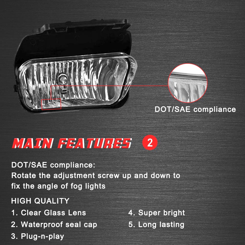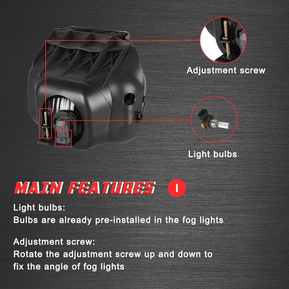 Features: High quality material, durable, against fading. Easy to Install, CAD designed to provide a perfect, factory type fit. Perfect for replacing broken stock fog lights or adding new fog lights. Increase visibility during heavy rain, snow, dense fog & night time driving.