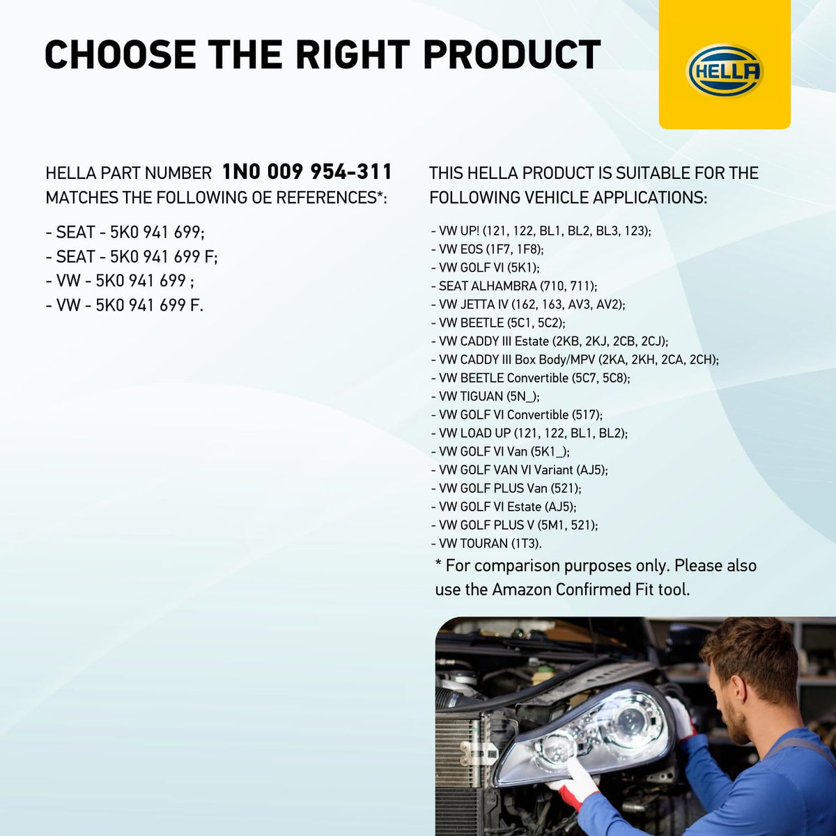Q: What vehicles are compatible with the HELLA 009954311 fog light assembly?A: The HELLA 009954311 fog light assembly is specifically designed for the Seat Alhambra models 710 and 711, manufactured from June 2010 onwards.
