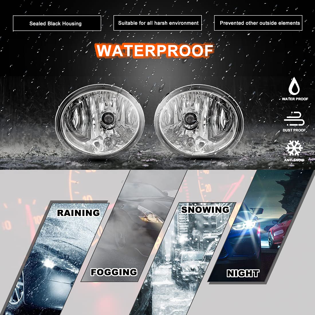 Q: How does the fog light assembly perform in harsh weather conditions?A: The Nixon Offroad Fog Light Set is designed to enhance visibility in harsh weather conditions. Its super waterproof housing prevents moisture, dust, and sand from entering, while its precise projection mode ensures strong penetration through fog and rain.