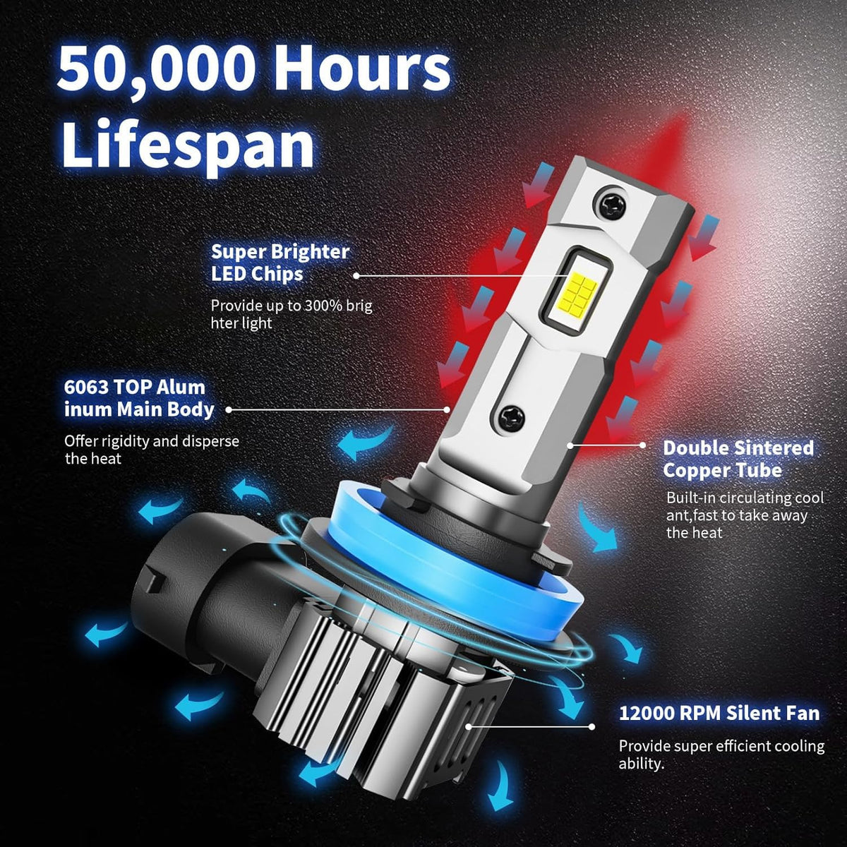 Q: How long can I expect the RCJ H11 bulbs to last?A: The RCJ H11 bulbs have an impressive lifespan of up to 50,000 hours, thanks to their aviation aluminum construction and efficient heat dissipation provided by the integrated 12000 RPM cooling fan.