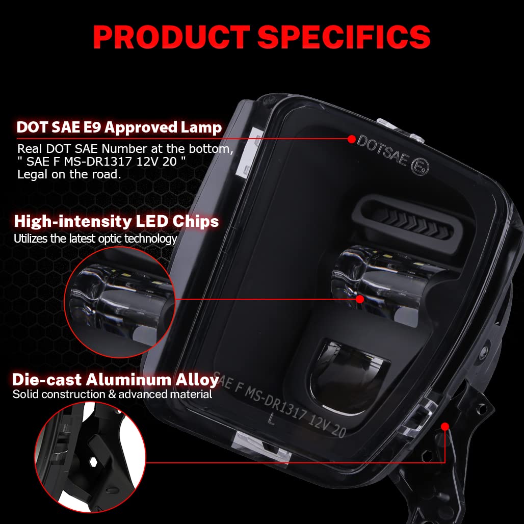 Features - Plug And Play. Come As A Set, Driver And Passenger Side Fog Lights Driving Lamps -6000K Clean White Light, Super Bright Leds With Crisp Line, 20% Brighter Than Stock Halogen Fogs - Shatterproof Pc Lens, Non-Fading, Waterproof, Perform Well In Night Times, Rain, Snow Or Fog