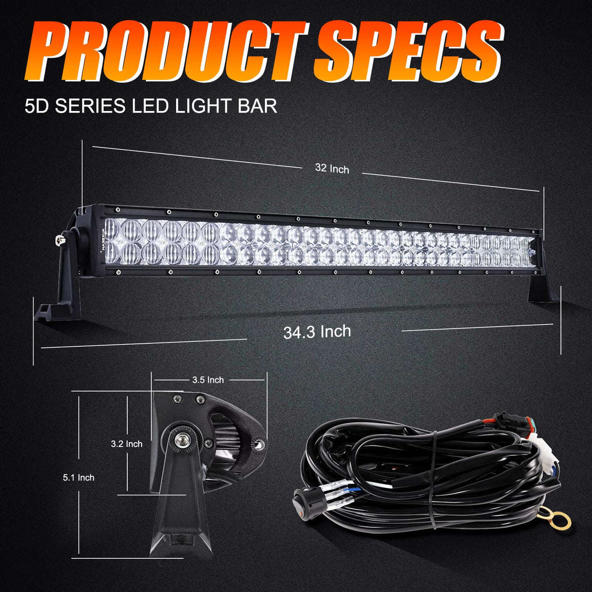?INCREDIBLE BRIGHTNESS?Experience unparalleled brightness with Auxbeam's 32 inch 5D LED dual row light bar. Made with 60pcs*3W intense LED chips, it provides a 18000LM penetration light beam and an extended irradiation distance. Enjoy faster response, longer-lasting, and energy-saving lighting. | ?UPGRADED SPOT FLOOD COMBO BEAM?Our spot and flood combo beam technology creates the best light beam, delivering an excellent view of your surroundings while illuminating distant objects. Enhance your road experience whether commuting or on a night drive. | ?LONG-LASTING LIFESPAN?Our work lamp is designed with evolutional 5D optic tech (Dual reflector cup + projector lens), thickened full aluminum profile, and IP68 waterproof rubber pad. This ensures that the light bar is highly waterproof, corrosion-resistant, and has a fast cooling radiator that extends the service life by more than 50,000 hours. | ?VERSATILE APPLICATION?This work light is perfect for most Jeeps, 4x4s, trucks, SUVs, ATVs, pickups, cars, and even boats. It also works great as construction lighting, garden lighting, and back up lights for camping and hunting. | ?WHAT'S INCLUDED?Our package includes 1 x 32in 5D Light Bar, 1 x plug and play wiring harness kit, 2 x Side brackets, 1 x installation manual, and all necessary installation accessories. It comes with everything you need for easy installation, so there's no need to purchase additional wiring harness or plug.