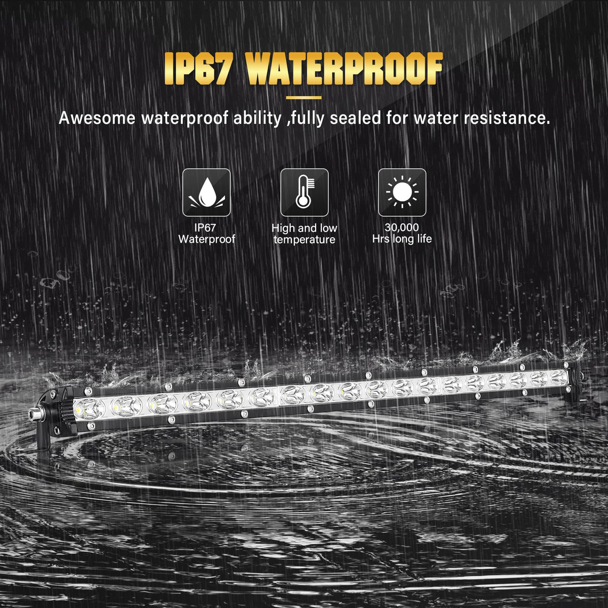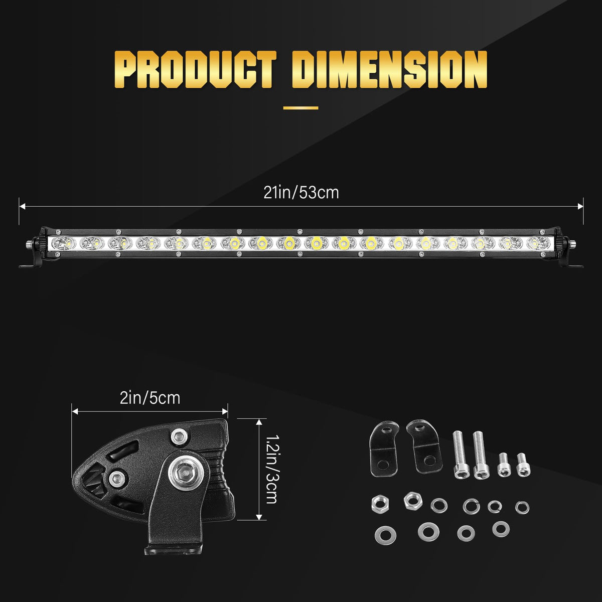 Specifications: LED Power: 90W (18 x 5W/pcs High Intensity LEDs) Beam Pattern: Spot Beam (Best choice as Fog lights) Operating Voltage: 10-30V DC(Fit 12V,24V Vehicles,Cars,Trucks ect.) Lifespan: 30,000 hours above Waterproof Rate: IP67 Color Temperature: 6000K Lumen: 9000LM Features: -Die-cast Aluminum Alloy Housing -Waterproof,dustproof,quakeproof, anti-explosion -Valid irradiation distance longer than normal bulb -Upgrade PC lens surface with high light transmission -Adjustable Mounting Brackets,easy to install Applications: Off-Road Vehicles: UTV, sand rail, buggy, ATV, SUV, truck, train, motorbike, bus, tank etc. Engineering Vehicles: excavator, Dozer ,road roller, Tractor , Harvester , Grain Drill , Mower , Snowplow ,bulldozer, crane, fork lift and mining truck etc.; Specialized Vehicles: fire engine, police car, rescue vehicle, Camping, Construction Lighting ,communication vehicle, military command vehicle etc. Others: boat, fishing, courtyard lamp, yacht, road/ street lamp, etc. Household Lighting: Garden, Backyard, Garage, Indoor Lighting. (Note: Use a voltage transformer/converter to convert the AC 110-120V to DC 12V/24V for indoor use.) Package Content: 1 x 20 inch LED light bar 2 x Mounting Bracket Note: They are aftermarket parts. NOT D.O.T. approved. Do not use if D.O.T. is required. For off road use only. Before installing this product, please check your state/provincial and local/municipal laws and regulations. The reason WHY choosing us - Perfect quality and unique design. - Waterproof and anti-corrosion. - Eco-friendly and heat dissipation. - Fit for off road, Truck, Power Sport, ATV, UTV, SUV - Warmly customer support.